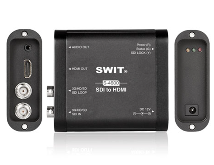 Pretvornik SWIT S-4600 SDI v HDMI® je prenosna in zanesljiva rešitev za pretvarjanje signalov SDI v kakovosti za oddajanje v HDMI® za uporabo s potrošniškimi in profesionalnimi zasloni. S-4600 podpira signale SD, HD in 3G-SDI do 3 Gb/s in omogoča nemoteno spremljanje na televizorjih HDMI®, LED zaslonih in projektorjih brez poseganja v integriteto signala.
