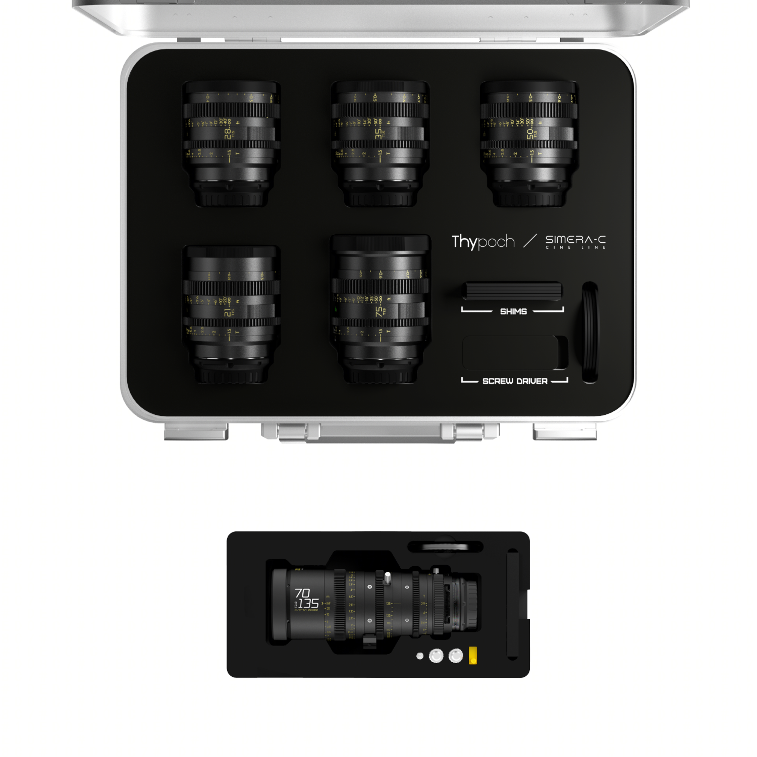 Komplet vrhunskih objektivov Thypoch Simera-C s fiksno goriščno razdaljo + objektiv DZOFILM Catta Zoom 70–135 mm. Skupna goriščna razdalja 21–135 mm pokriva različne ustvarjalne potrebe.