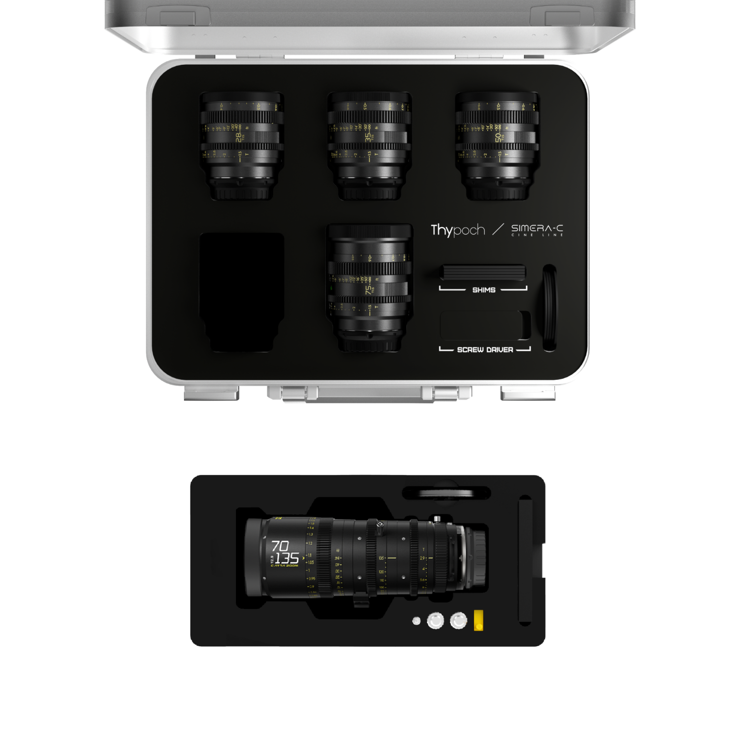 Komplet vrhunskih objektivov Thypoch Simera-C s fiksno goriščno razdaljo + objektiv DZOFILM Catta Zoom 70–135 mm. Skupna goriščna razdalja 28–135 mm pokriva različne ustvarjalne potrebe.