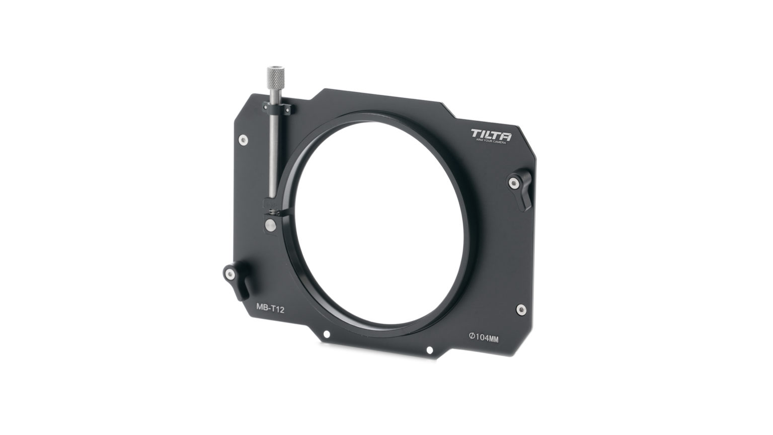 Tilta MB-T12-104 Clamp-On Adapter omogoča varno pritrditev matte boxa MB-T12 4×5,65" na objektive z zunanjim cevastim delom 104 mm, opremljen je s trdno sponko, ki se pritrdi s palčnim vijakom, in trpežno aluminijasto konstrukcijo.