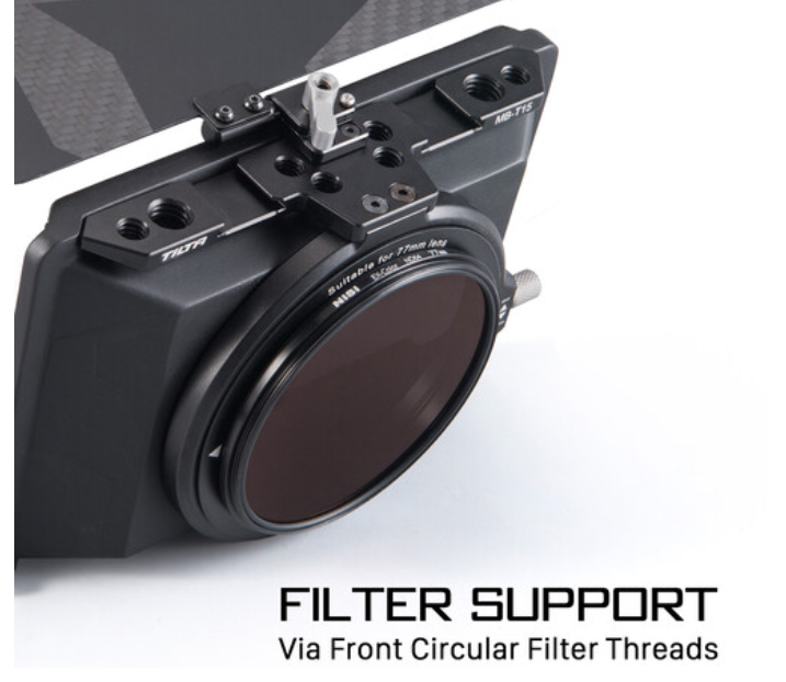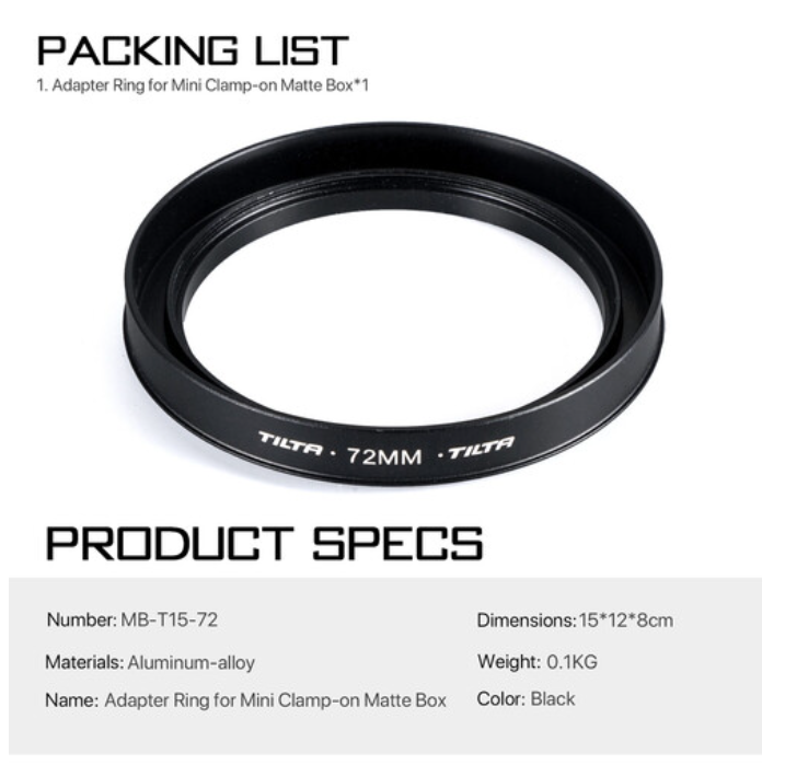 Adapterni obroč Tilta MB-T15-72 omogoča varno namestitev Tilta Mini Clamp-On Matte Box na objektive s premerom 72 mm, hkrati pa zagotavlja 72-mm navoj za privijalne filtre.
