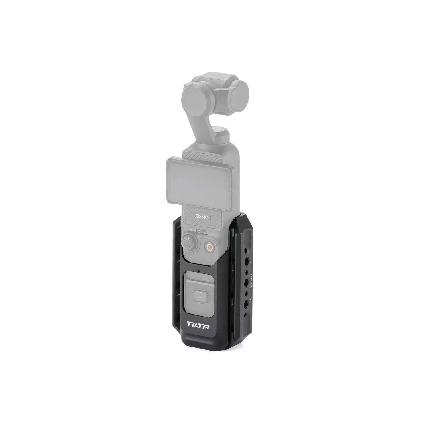 Uradni ročaj in razširitveni modul pritrdite na DJI Osmo Pocket 3 s pomočjo spodnjega 1/4″ navoja za popolno prileganje, ki ne ovira zaslona, gumbov ali funkcij kamere.