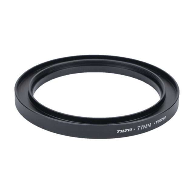 Tilta adapterski obroč za Tilta Mirage Matte Box (77 mm) za priključitev objektiva z navojem za 77 mm filter na Tilta Mirage Matte Box. Adaptacijski obroček ima na sprednji strani tudi notranji navoj 77 mm, ki omogoča namestitev filtra na objektiv.