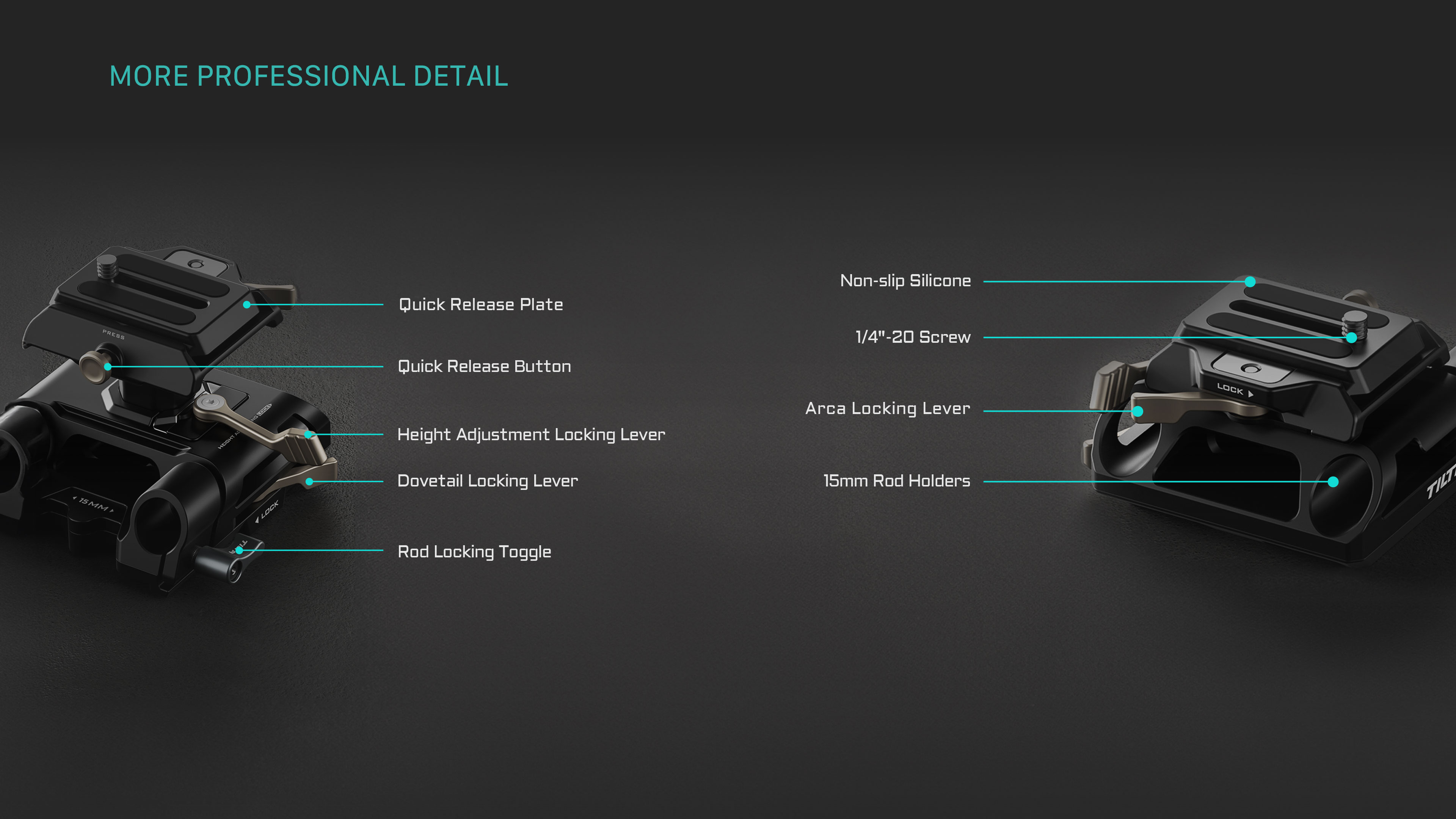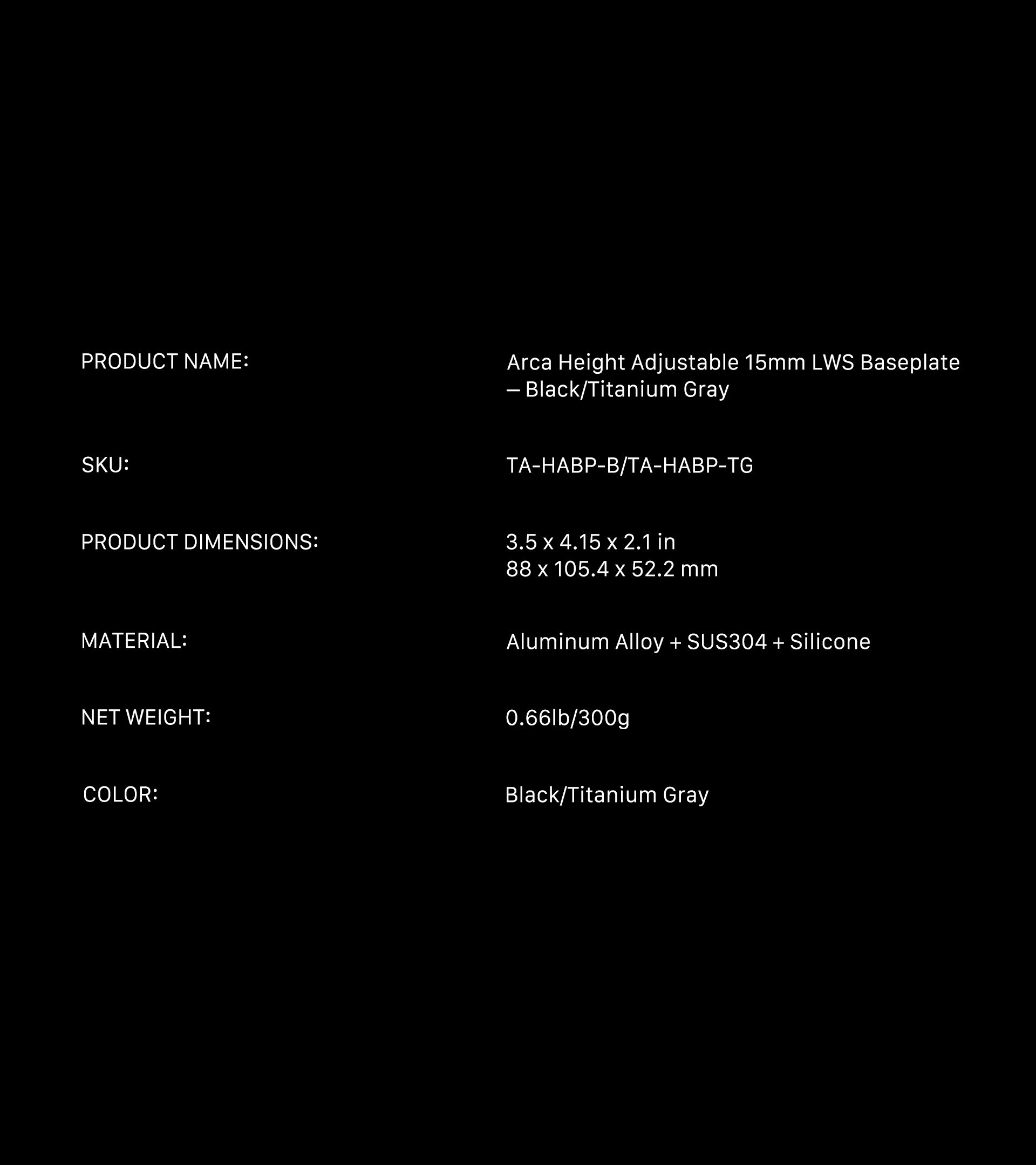 Predstavljamo osnovno ploščo Arca LWS z nastavljivo višino 15 mm. Ta 15-milimetrska osnovna plošča uporabnikom omogoča uporabo 15-milimetrskih palic (niso priložene) za namestitev različnih dodatkov, kot so mat boxi ali sistemi za sledenje ostrenju. Edinstvena lastnost te enote je nastavljiva višina, ki uporabnikom omogoča nastavitev višine fotoaparata glede na palice.