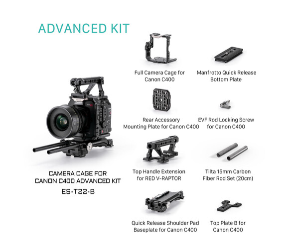 Tilta ES-T22-B Camera Cage za Canon C400 (Advanced Kit) ponuja popoln modularni ekosistem, zasnovan za izboljšanje stabilnosti, razširitev možnosti montaže in poenostavitev prehodov med snemanjem s stativom, ramenskim nosilcem in ročnim snemanjem. Kletka vključuje zgornjo, levo in desno stransko ploščo, spodnjo ploščo za hitro sprostitev tipa Manfrotto, zgornji ročaj, 7,8-palčne 15-milimetrske palice, večnamensko zadnjo ploščo in dodatno zgornjo ploščo B za večjo združljivost dodatkov. Priloženi vijak za zaklepanje palice EVF zagotavlja popolno združljivost z elektronskim iskalom Canon C400.