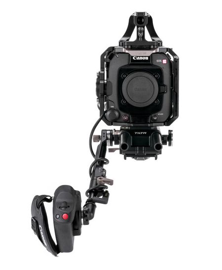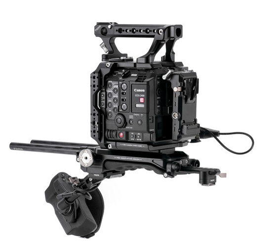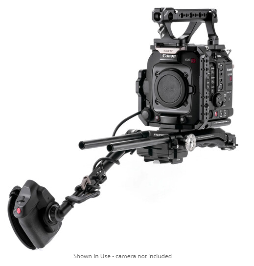 Tilta Pro Kit spremeni Canon C400 v popolnoma opremljeno kinematografsko delovno konje, hkrati pa ohranja njegove kompaktne prednosti. Lahka aluminijasta kletka je sestavljena iz modularnih plošč, ki ponujajo obsežne protivrtilne navoje 1/4"-20 in 3/8"-16, NATO-tirnico, ARRI-rozetke in 15-mm LWS-podporo. Priložena plošča za baterijo V-Mount napaja kamero in dodatke, podlaga za ramensko blazinico s hitrim sprostilnim mehanizmom omogoča hiter prehod iz ročnega v stativ (Manfrotto na vrhu, VCT-U14 na dnu), zgornji ročaj pa dodaja dodatne pritrdilne točke. Desni podaljšek z 50 cm USB-C kablom prestavi ročaj za nadzor C400 za večje udobje pri nošenju na rami, medtem ko dve ogljikovodni palici podpirata matte boxe ali follow focus. Idealno za dokumentarne in narativne ekipe, ki potrebujejo hitrost, ravnotežje in razširljivost.