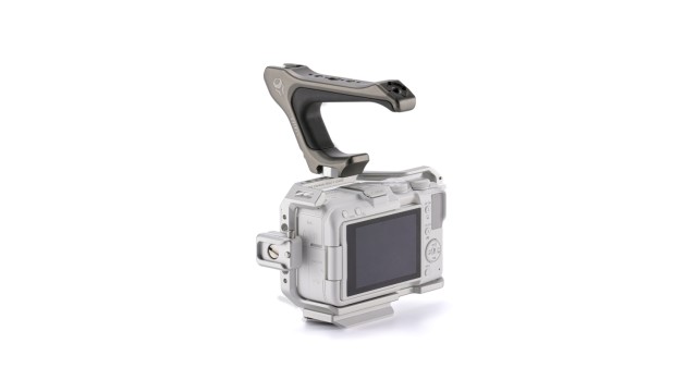Oblika vključuje integriran ročaj z gumijastim oprijemom, ki se prilagaja obliki dlani, zaradi česar je držanje kamere v roki udobnejše kot pri tradicionalni kletki.