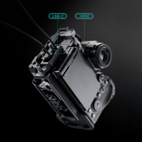 Priložena HDMI in USB-C kabelna sponka zagotavlja, da oba kabla ostanejo varno pritrjena, ko sta priključena na ohišje kamere. Trije stični točki med kamero in kletko zagotavljajo trdno povezavo z ohišjem kamere in trdno podlago za namestitev dodatne opreme.