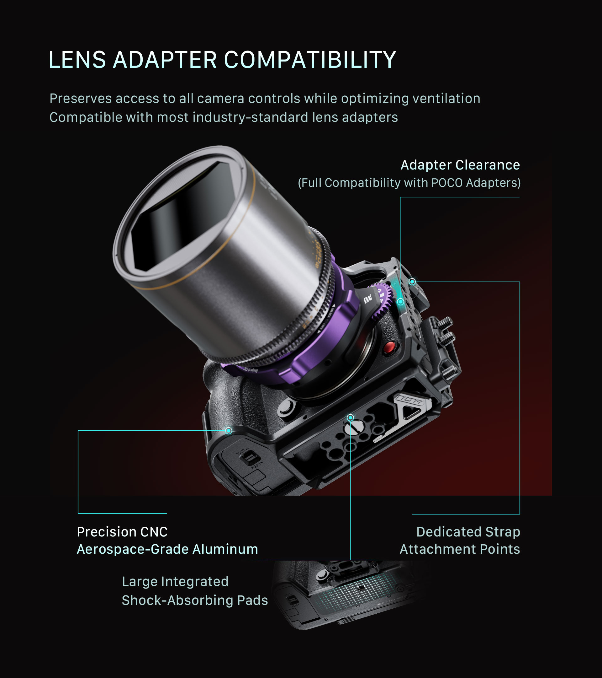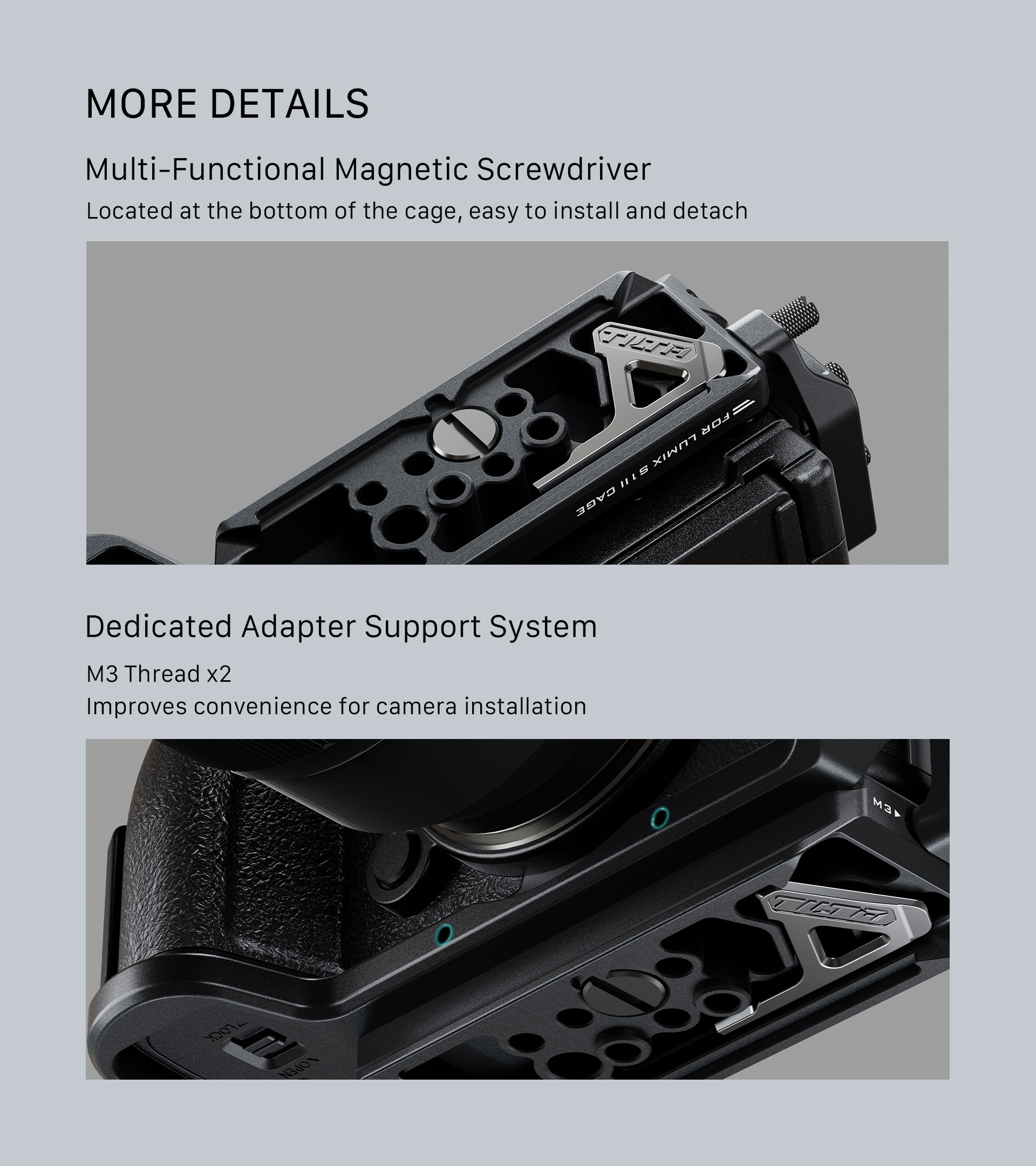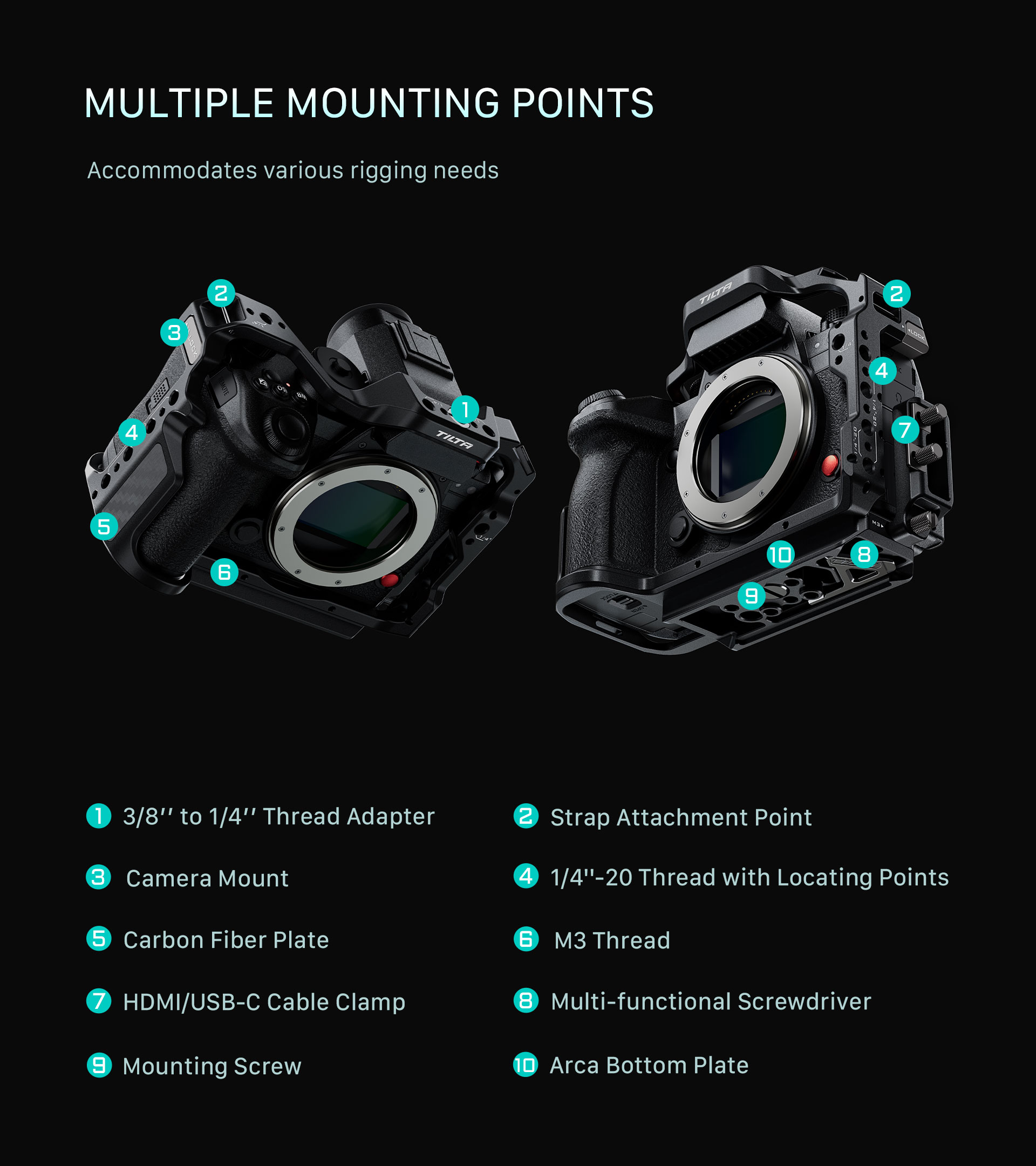 Osnova tega kompleta je polna kamera, ki zagotavlja zaščito in razširja možnosti montaže za S1R II, Lumix S5 II, S5 IIX in G9 II.