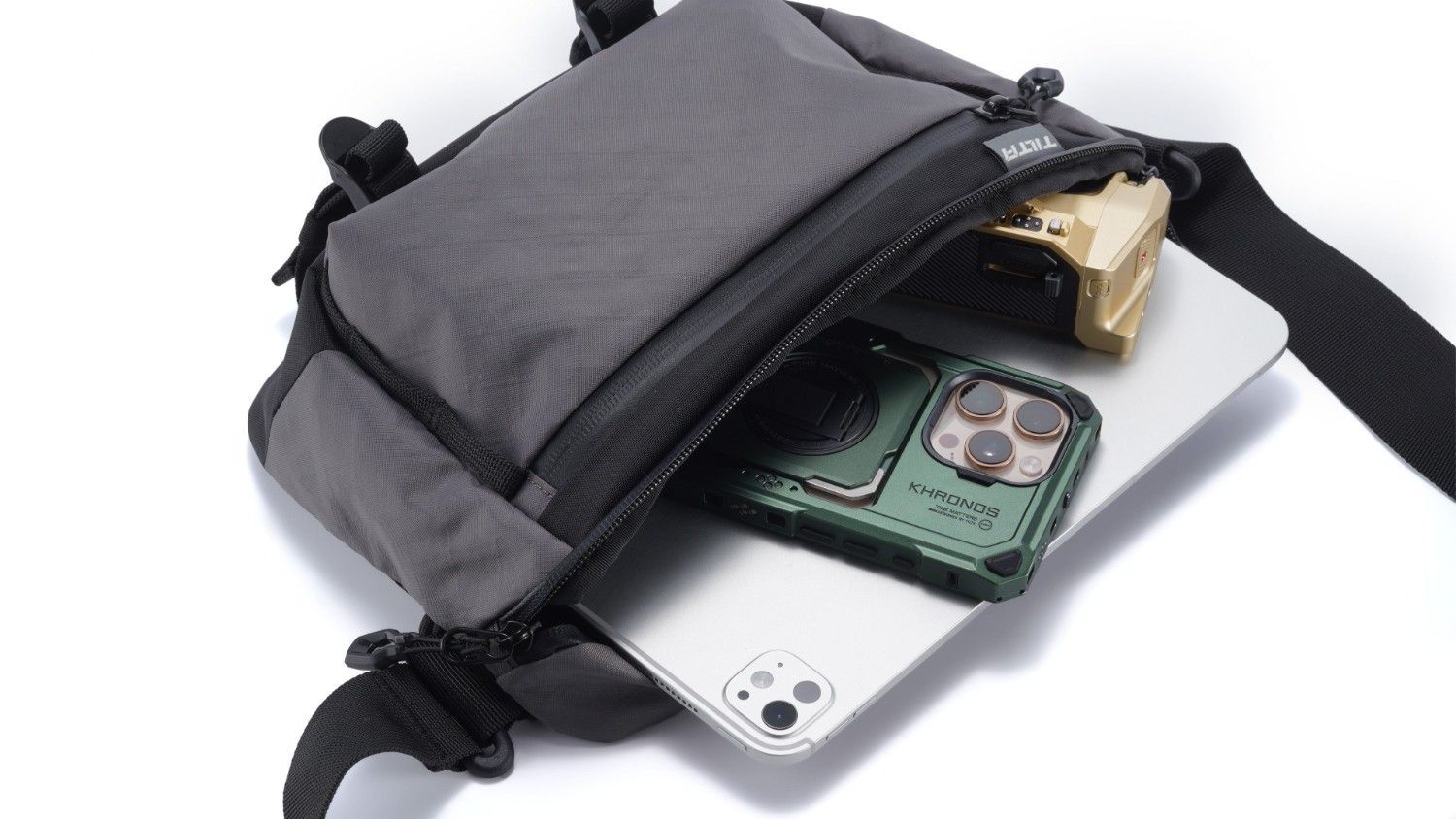 Khronos Ecosystem Carrying Pouch, rojen za imperij filmskega ustvarjanja Tilta Khronos iPhone, je 5-litrski taktični kokon, ki vašo opremo za 800 dolarjev spremeni v bojno opremo, ki jo lahko vzamete s seboj. V prostorno glavno žepno odprtino vstavite iPhone 17 Pro Max v ovitku, PD Focus Handle, hladilni ventilator, filter, Mini LED in rezervni T-SSD; baterije, ND-je in AirPods shranite v skrito notranjo žepno odprtino z zadrgo. Nato izberite način nošenja: štirje zadnji MOLLE-style pasovi in dvojne sponke za hitro sprostitev omogočajo nošenje nizko na boku (prek pasu), visoko čez prsi (v načinu slinga) ali na hrbtu katerega koli nahrbtnika prek navpičnih verižnih povezav. Challenge-lab certificirani Ecopak® EPX200 – 100 % recikliran, 200-denier ripstop z PU vodotesnim laminatom – se ne boji monsunskih nalivov, tiho zapiranje SBS zadrg pa vas ne bo izdalo med tiho snemanje dokumentarca. Z merami 43 × 25 × 15 cm in težo 1,11 kg se lahko stisne na ravno površino za shranjevanje v potovalni torbi, vendar se razširi, da sprejme celoten Ultimate Kit. Hypalon-okrepljeni ročaji, bartacked točke napetosti in diskretna Tilta značka dopolnjujejo profesionalni videz. Od posnetkov s strehe do intervjujev v stranskih ulicah – ta torba bo vaš Khronos ekosistem varovala, napolnila in zaščitila pred vremenskimi vplivi, saj izpad delovanja ni filmski.