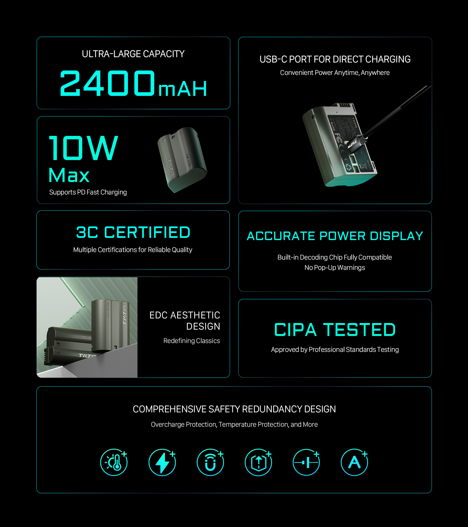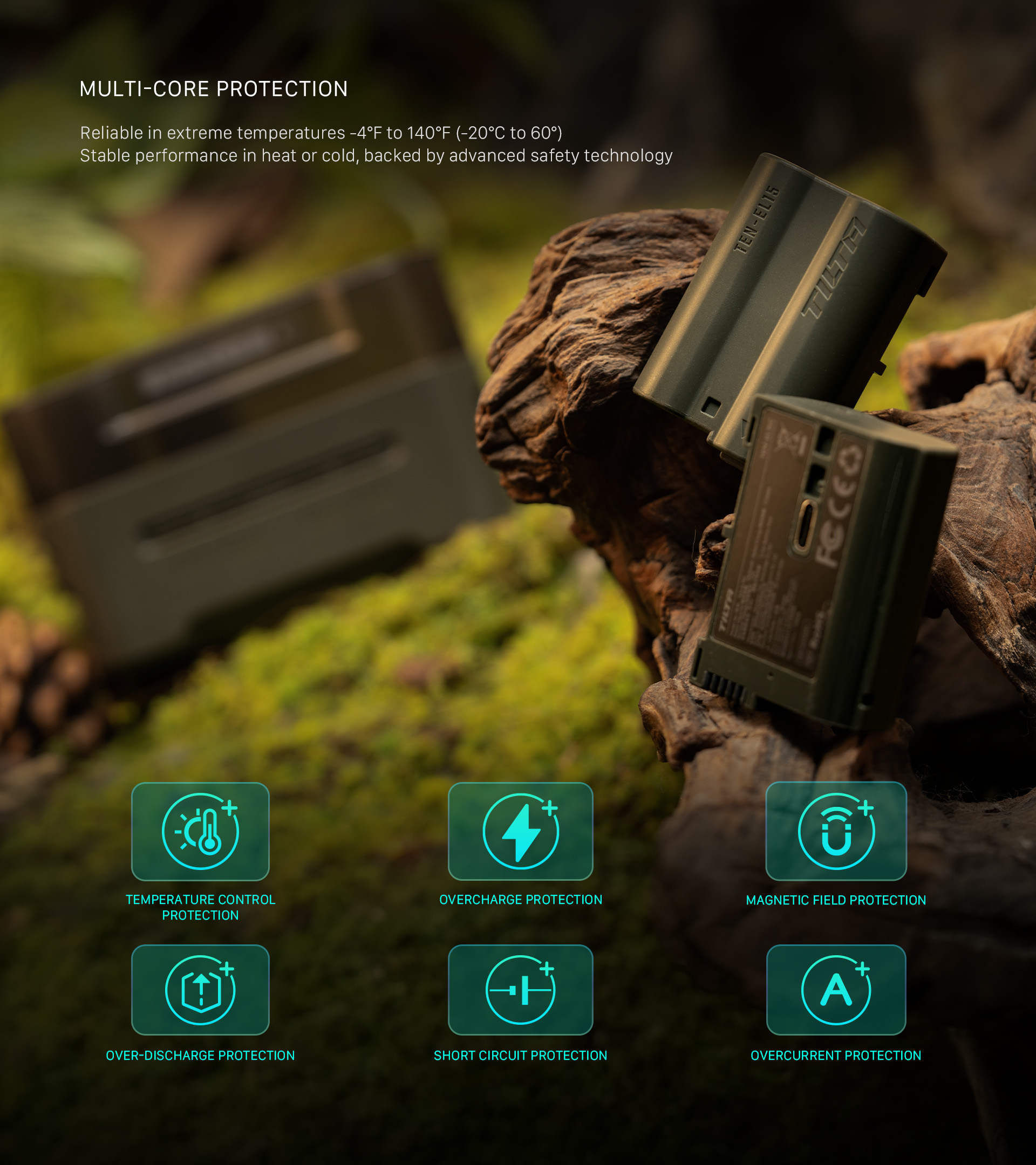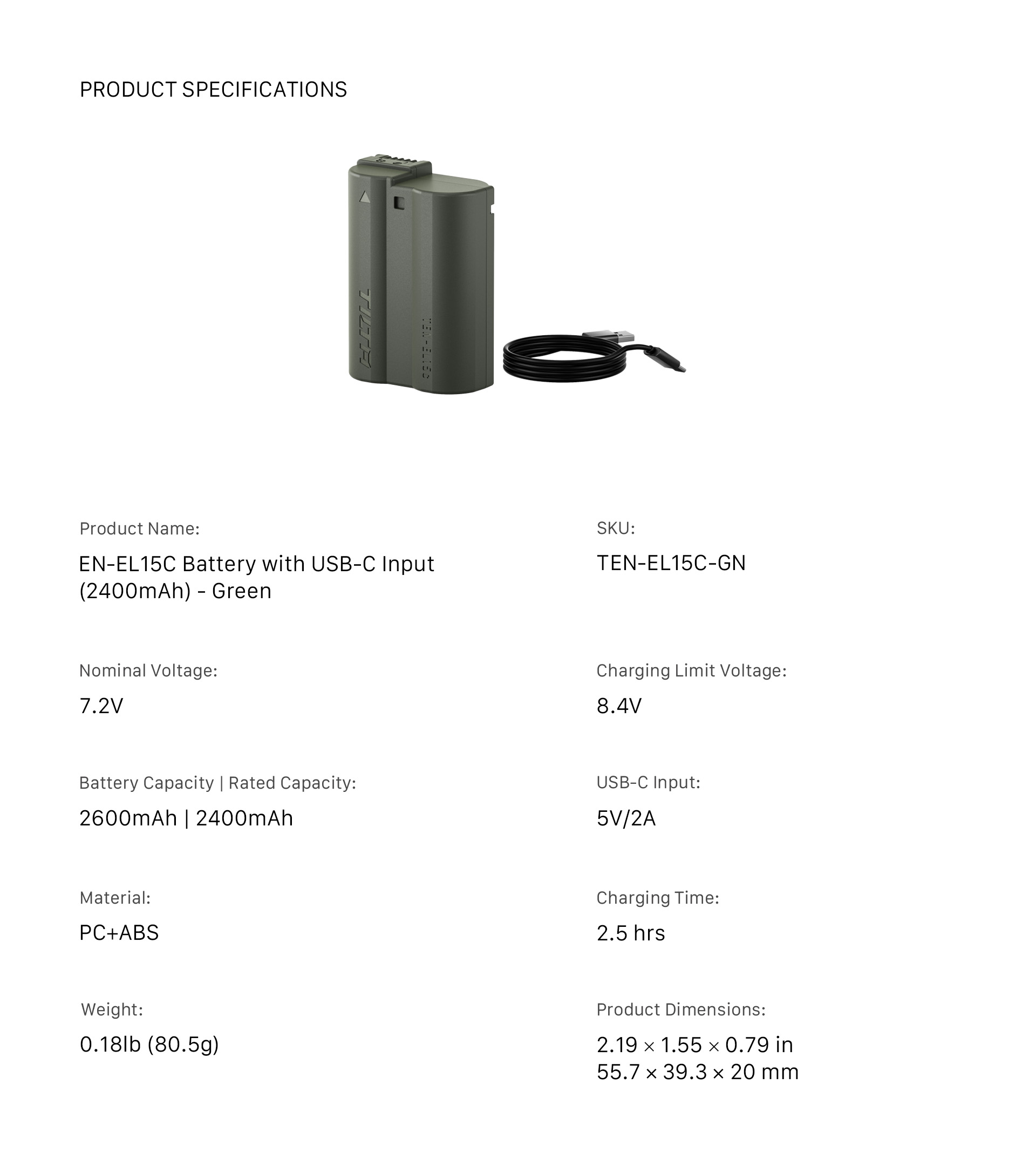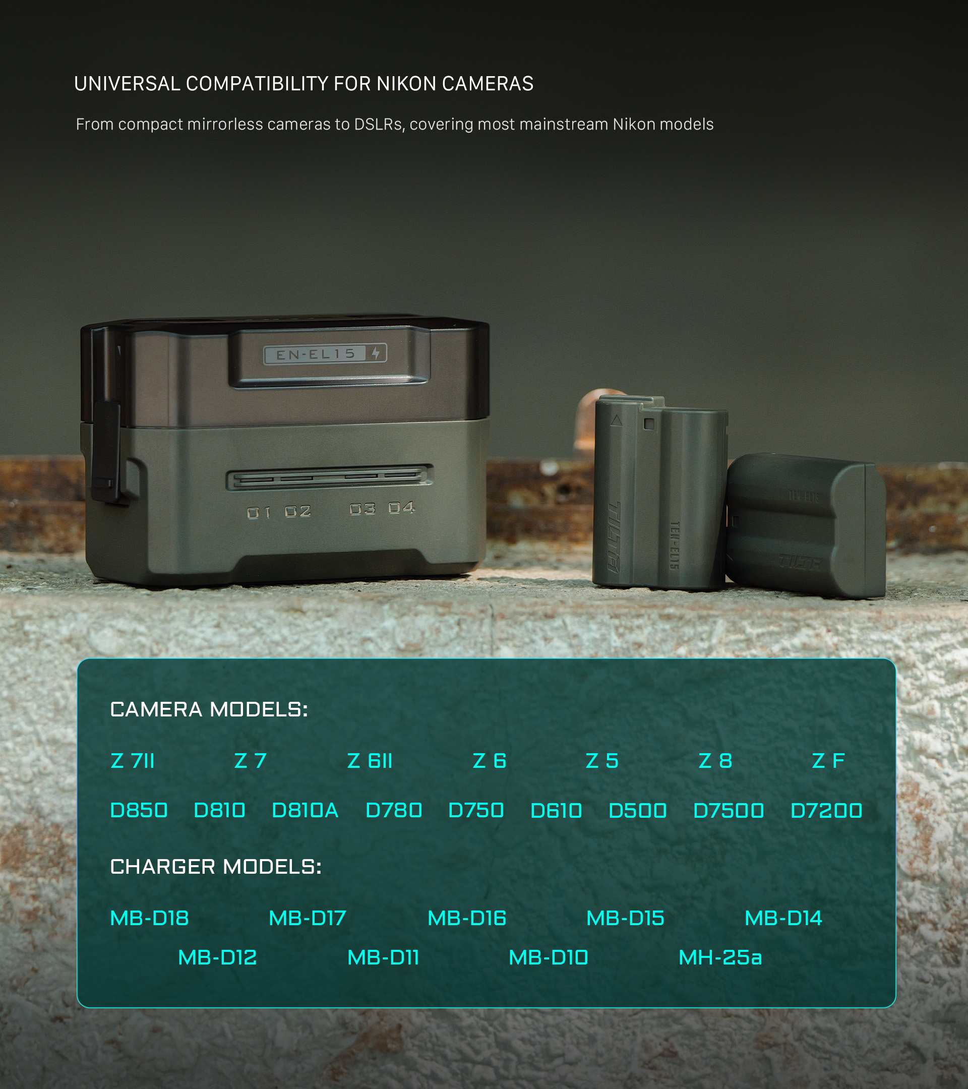 Baterija visoke zmogljivosti EN-EL15C je zasnovana tako, da zagotavlja zanesljivo in dolgotrajno napajanje fotoaparata ter vam omogoča daljše fotografiranje brez prekinitev. Ta baterija z inovativno baterijsko celico z visoko energijsko gostoto zagotavlja daljšo vzdržljivost, zato je idealna za fotografiranje in snemanje videoposnetkov.