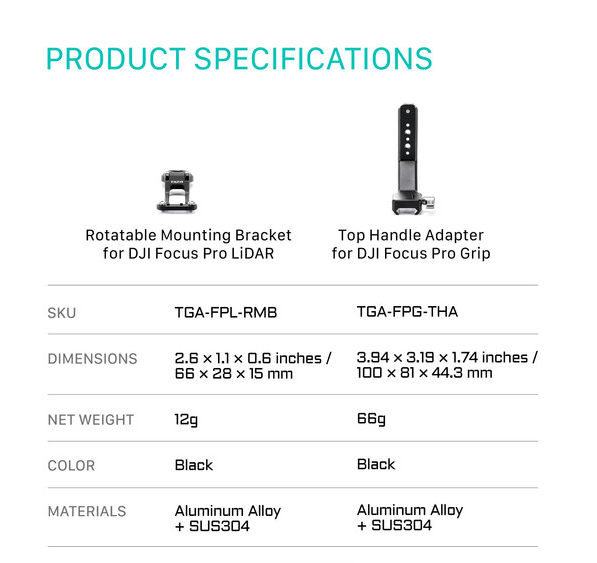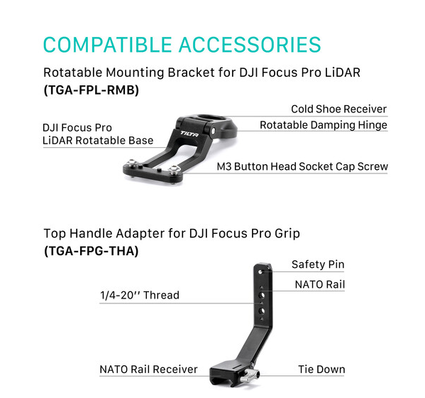 Vključen je tudi adapter za zgornji ročaj, zasnovan posebej za ročaj DJI Focus Pro. Ta adapter ima vgrajen NATO-režni sprejemnik z varnostnim zatičem in več 1/4"-20 pritrdilnimi navoji, ki omogočajo varno in hitro pritrditev na široko paleto kamer in opreme. Komplet dopolnjuje kompaktna 0,7" NATO-režna pritrditev iz aluminija in nerjavečega jekla, ki omogoča varno pritrditev dodatne opreme s standardnimi NATO-sponkami. Vsi ti sestavni deli skupaj zagotavljajo robustno, lahko in visoko konfigurativno rešitev za razširitev za uporabnike DJI Focus Pro.