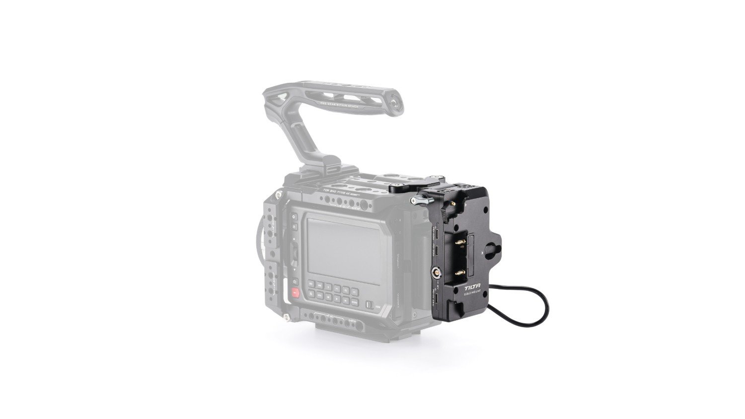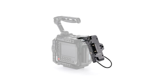 Ta V-Mount baterijska plošča se pritrdi neposredno na našo kamero kletko za Blackmagic PYXIS 6K/12K in ima več izhodnih priključkov za napajanje, kot so PD USB-C, P-Tap in 2-pinski priključek, ter vhod PD USB-C.
