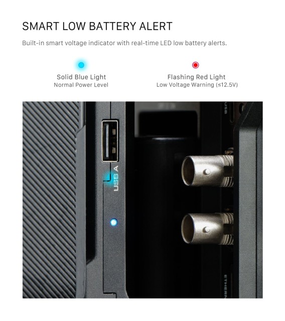 Vhod USB-C je še posebej uporaben, saj omogoča uporabnikom napajanje plošče za baterije in vseh priključenih dodatkov brez pritrjene baterije V-Mount, kar je idealno za zamenjavo med delovanjem ali namestitev kamere v lažjih konfiguracijah.