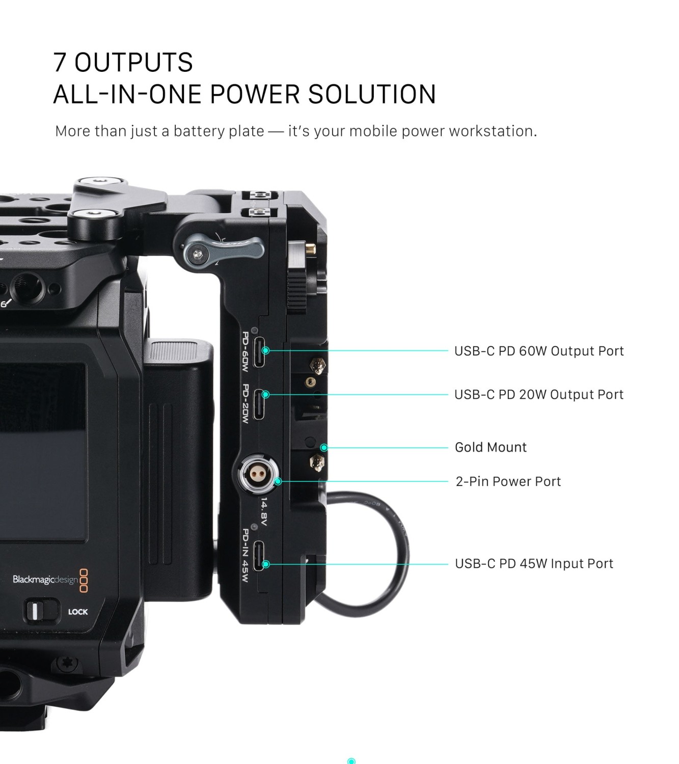 Ta baterijska plošča V-Mount se namesti neposredno na našo kamero Cage za Blackmagic PYXIS 6K/12K in ima več izhodnih vrat za napajanje, kot so PD USB-C, P-Tap in 2-pinski, ter vhod PD USB-C.