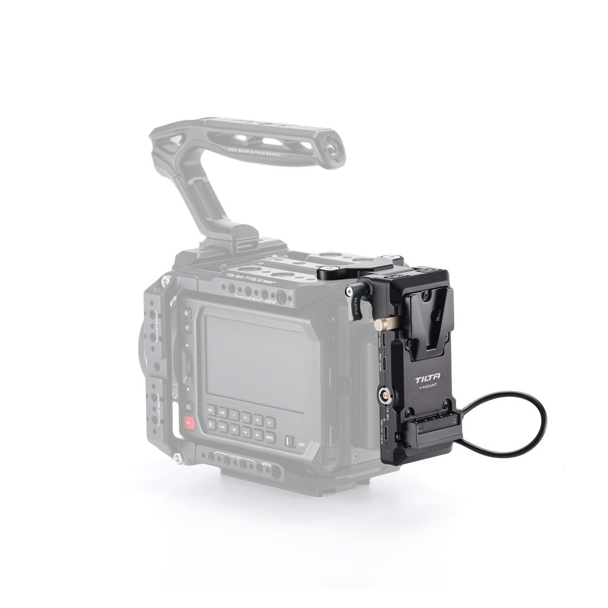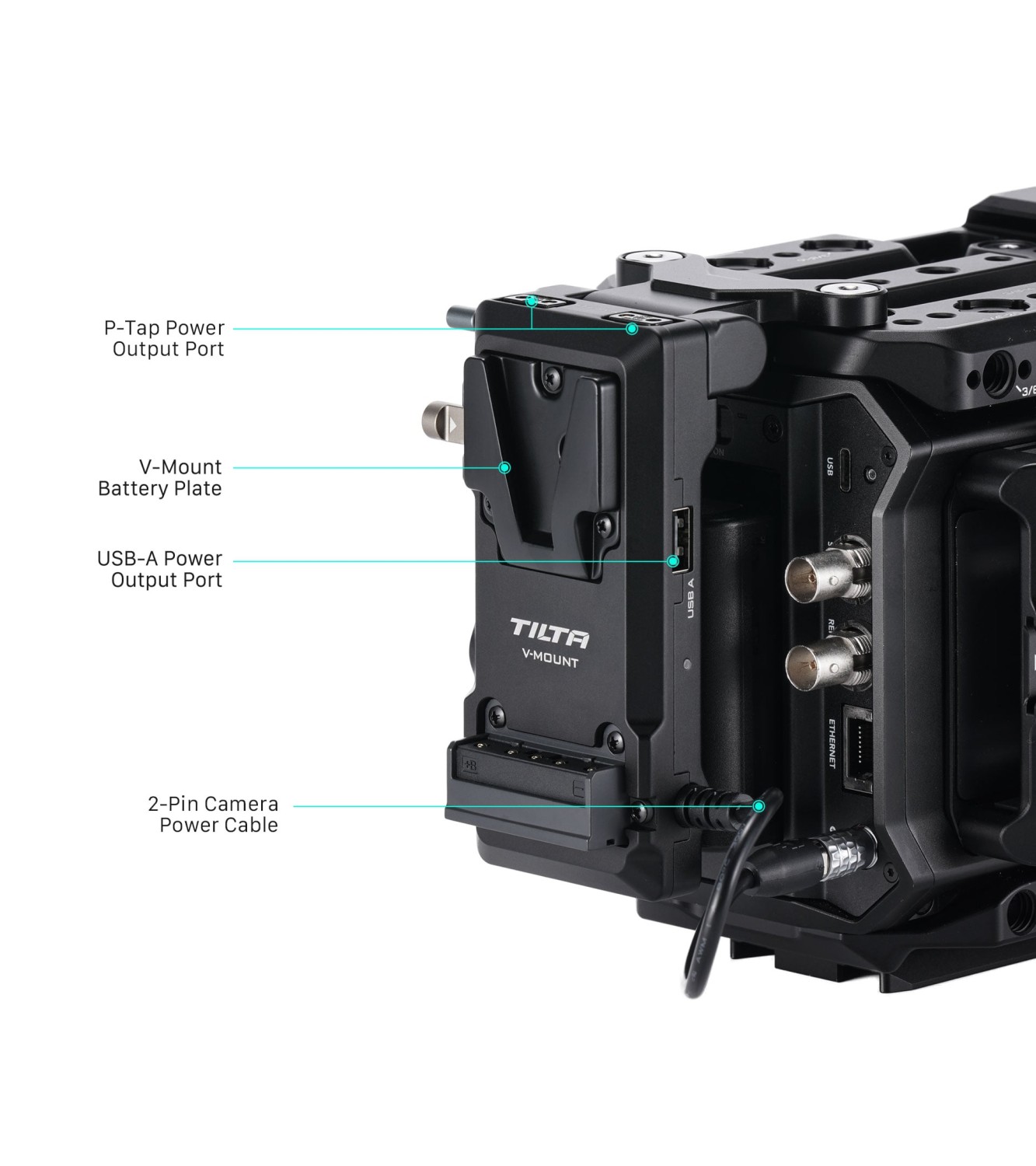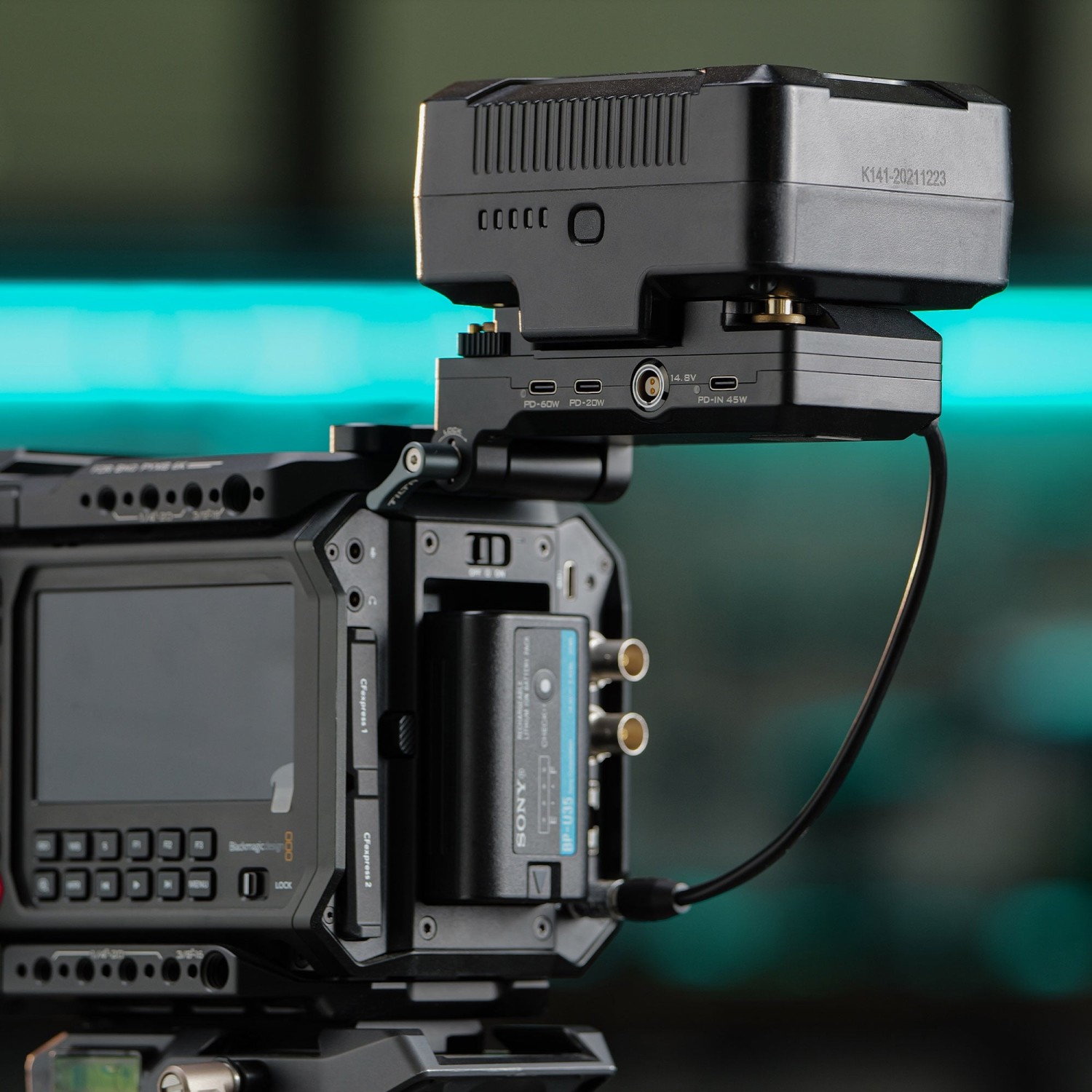 Ta V-Mount baterijska plošča se pritrdi neposredno na našo kamero kletko za Blackmagic PYXIS 6K/12K in ima več izhodnih priključkov za napajanje, kot so PD USB-C, P-Tap in 2-pinski priključek, ter vhod PD USB-C.