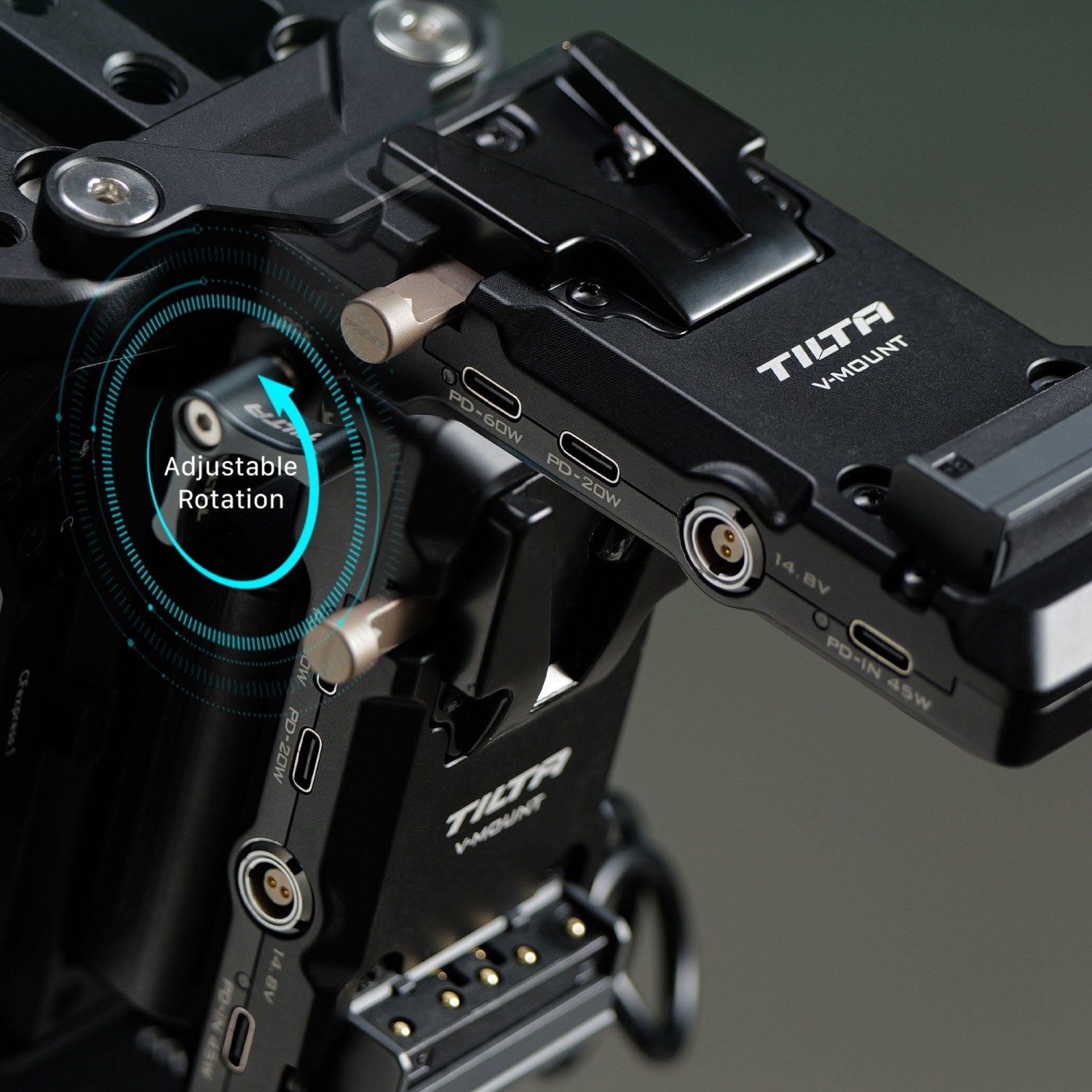 Plošča ima tudi vrtljivo pritrditev, ki uporabnikom omogoča enostaven dostop do vgrajenih baterij kamere, kar je odlična možnost za hitro zamenjavo, saj lahko majhna vgrajena baterija napaja kamero med zamenjavo V-Mount baterije.