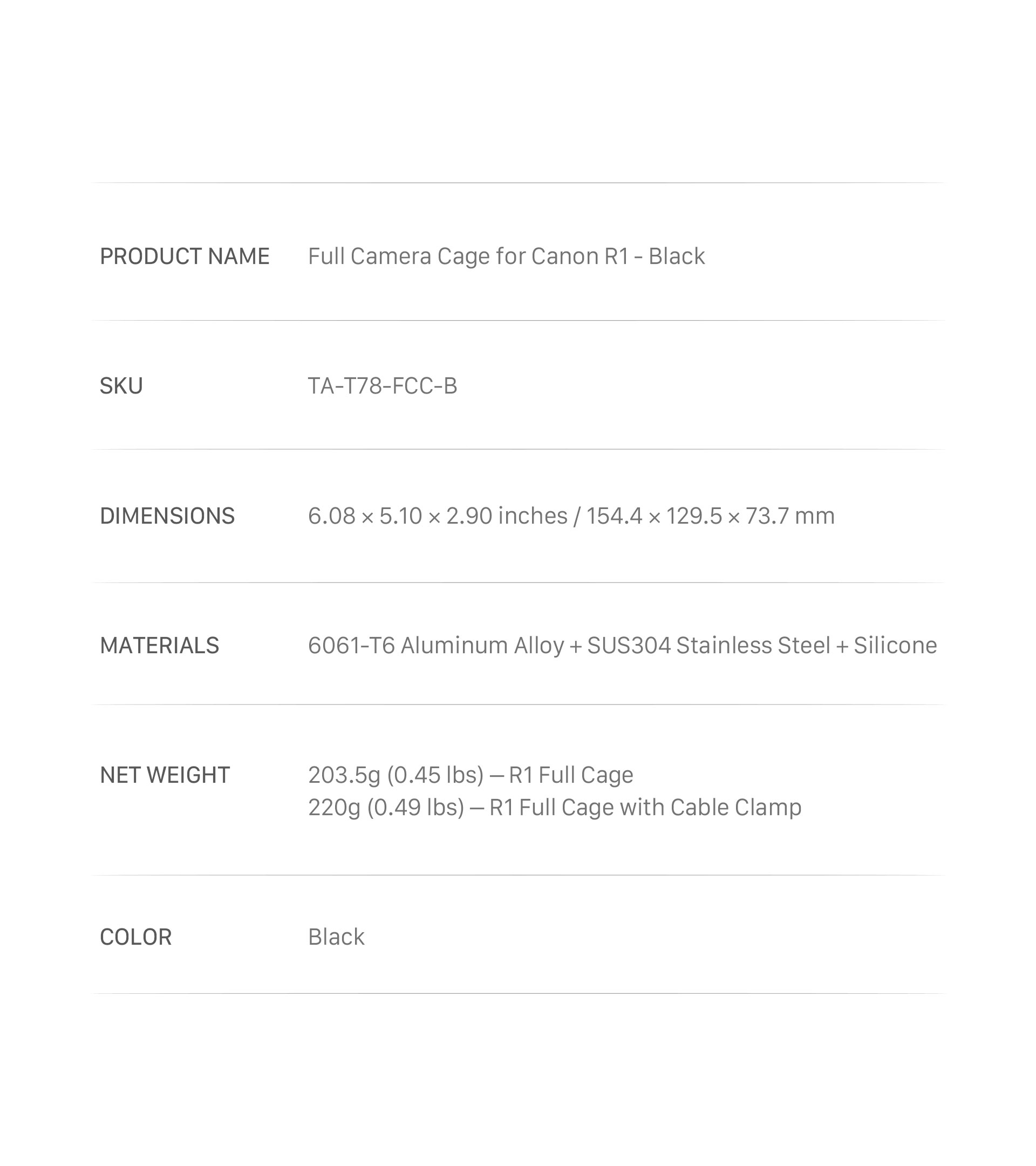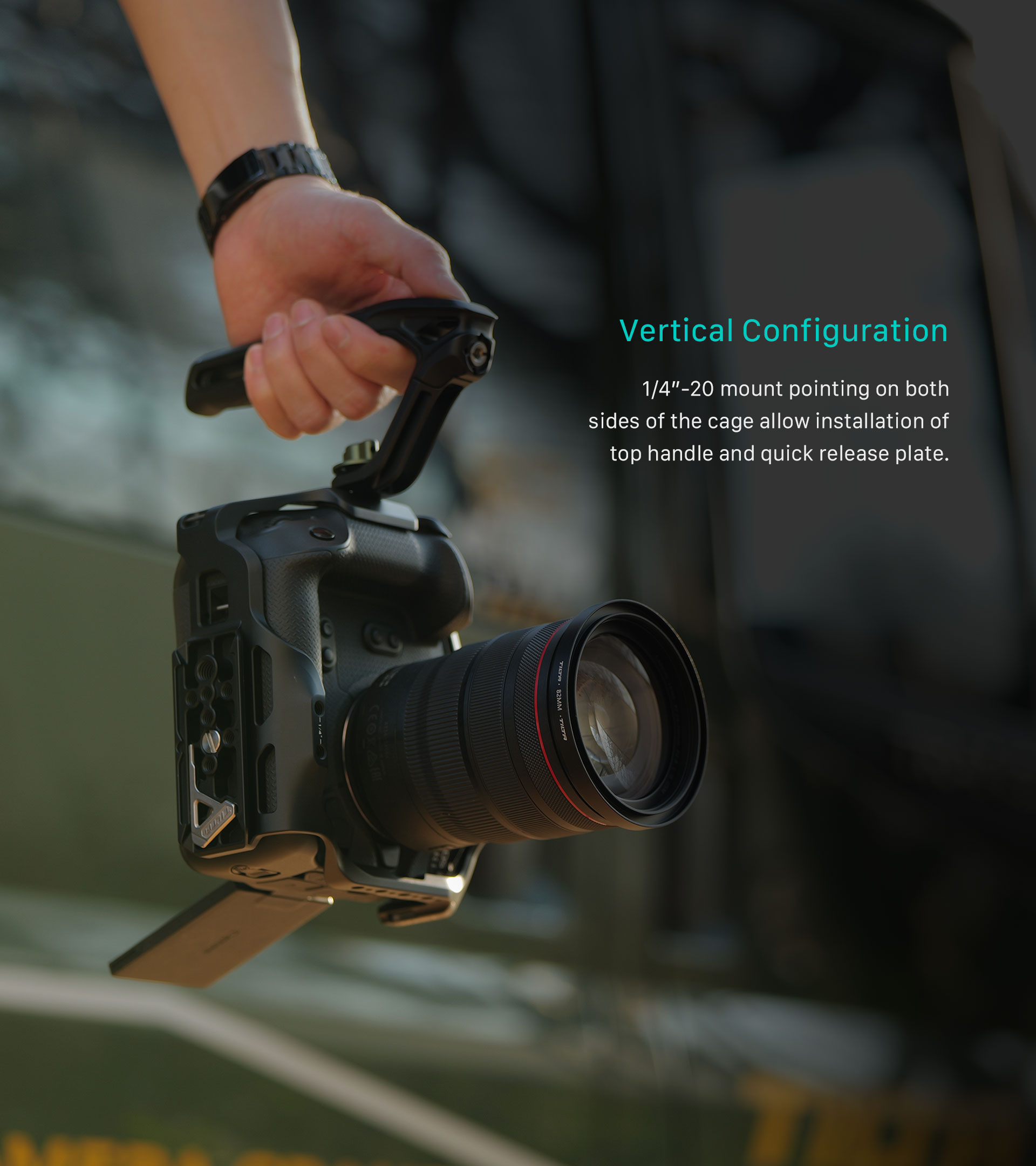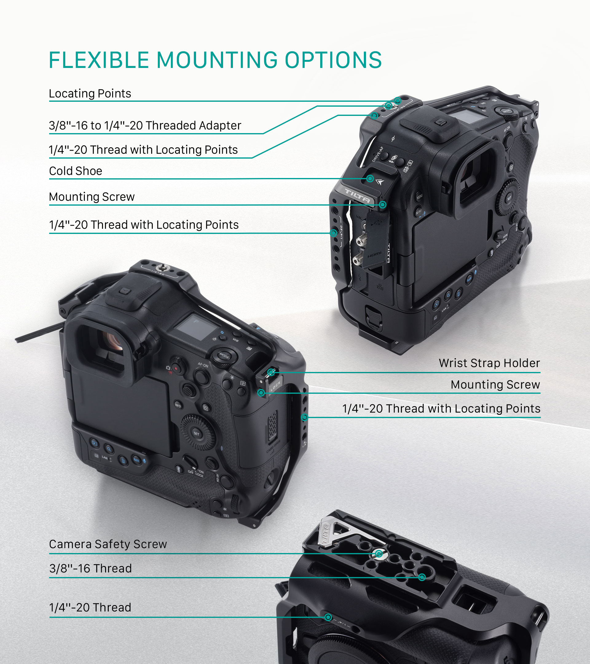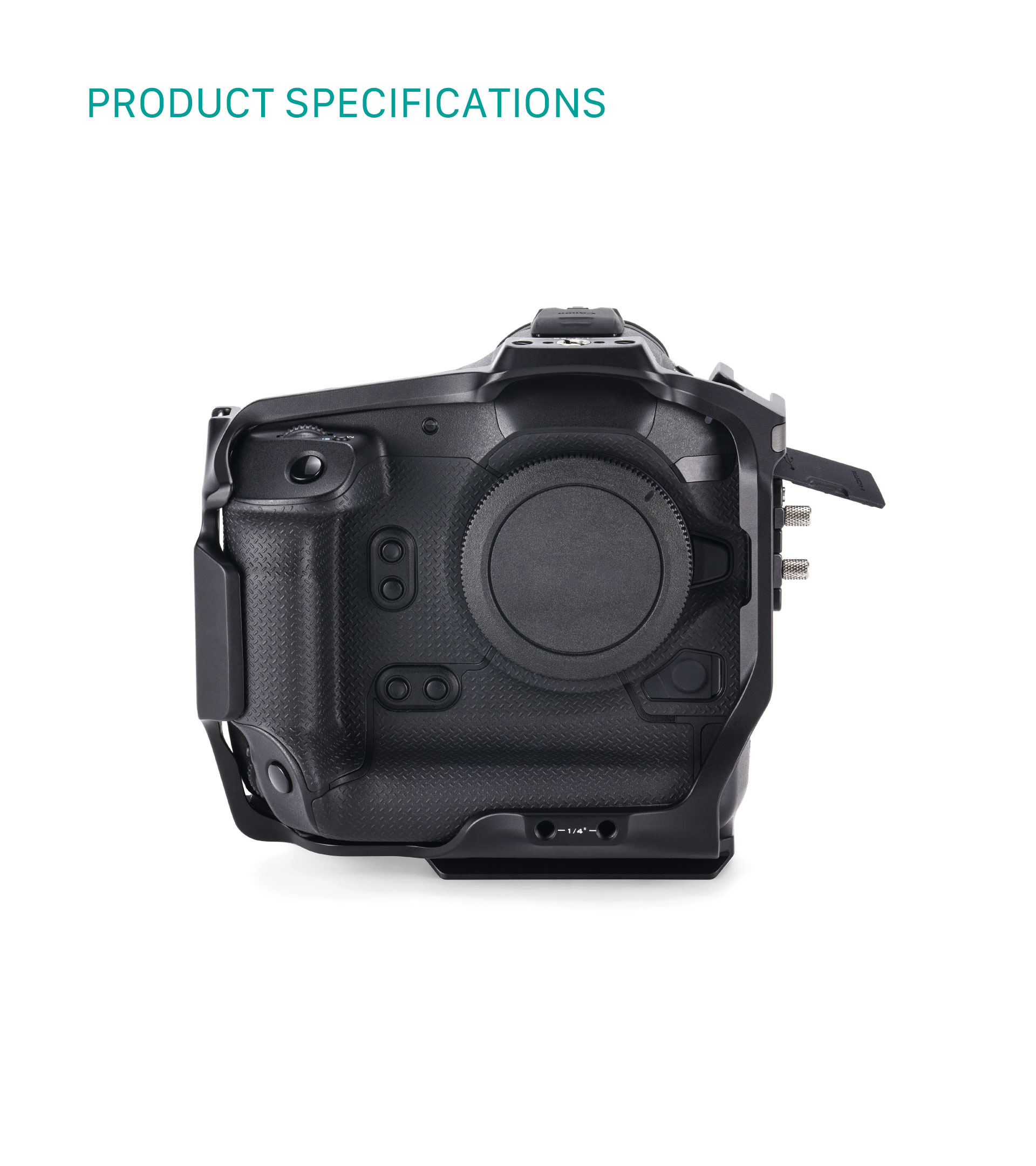 Predstavljamo celotno kletko za fotoaparat Canon R1. Zagotavlja dodatno zaščito ohišja fotoaparata, hkrati pa razširja možnosti pritrditve različnih dodatkov. Ta kletka za fotoaparat ima sprejemnik za hladno peto, nastavke za zapestni trak, navoj 1/4″-20 z lokacijskimi točkami in adapter za navoj 3/8″-16 na 1/4″-20.
