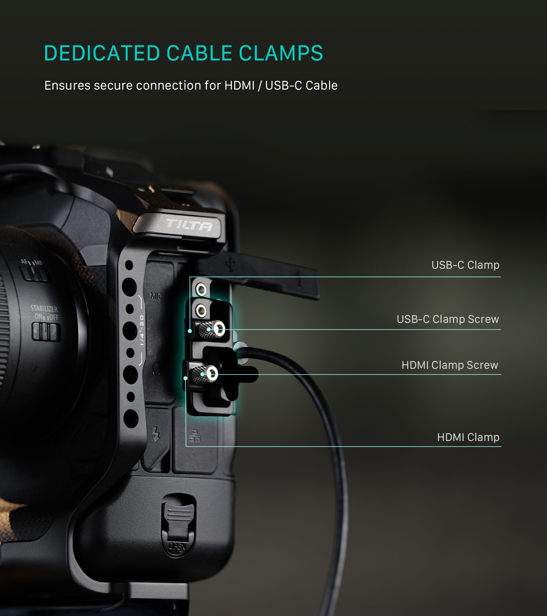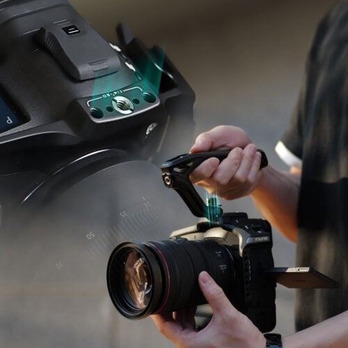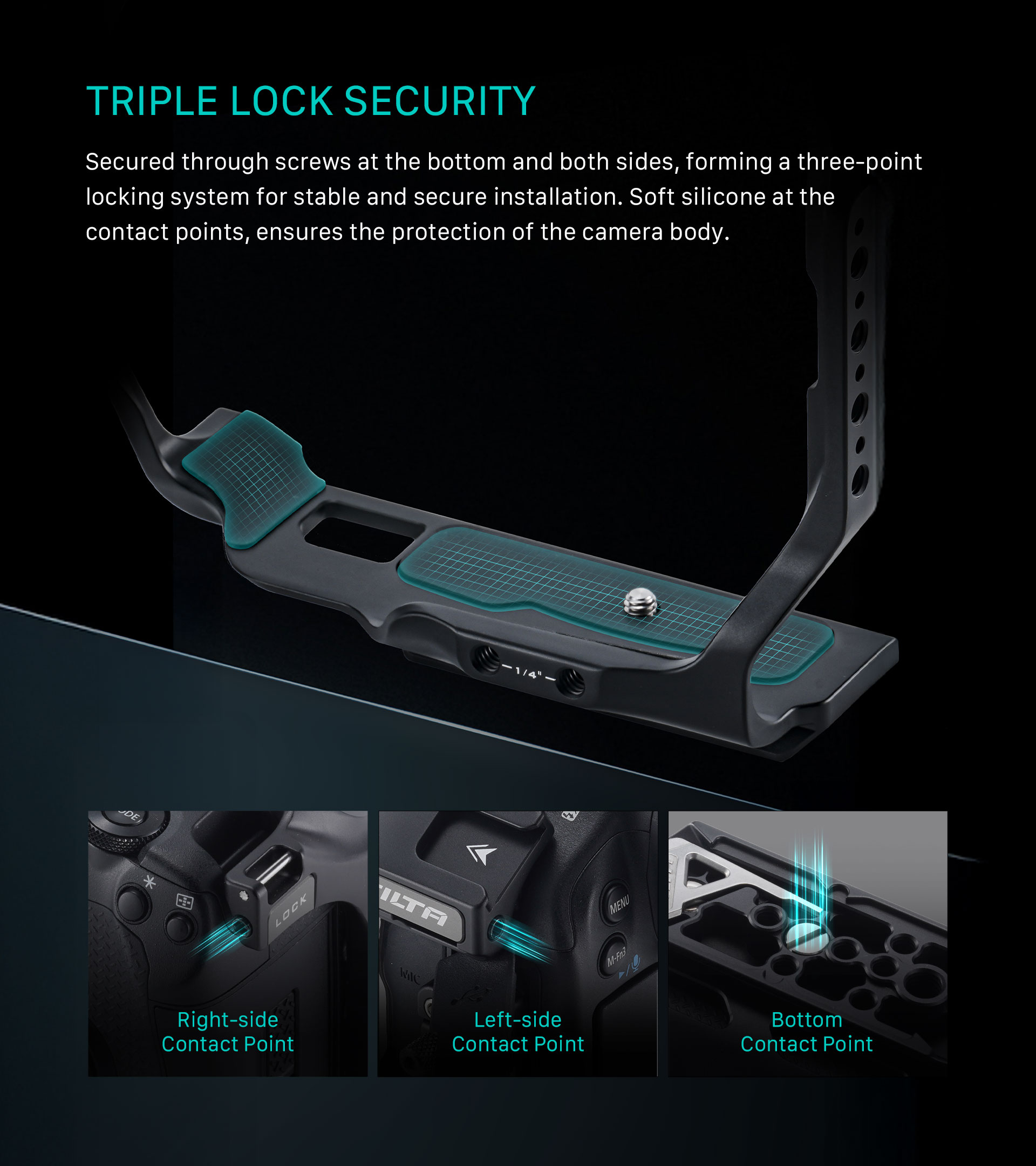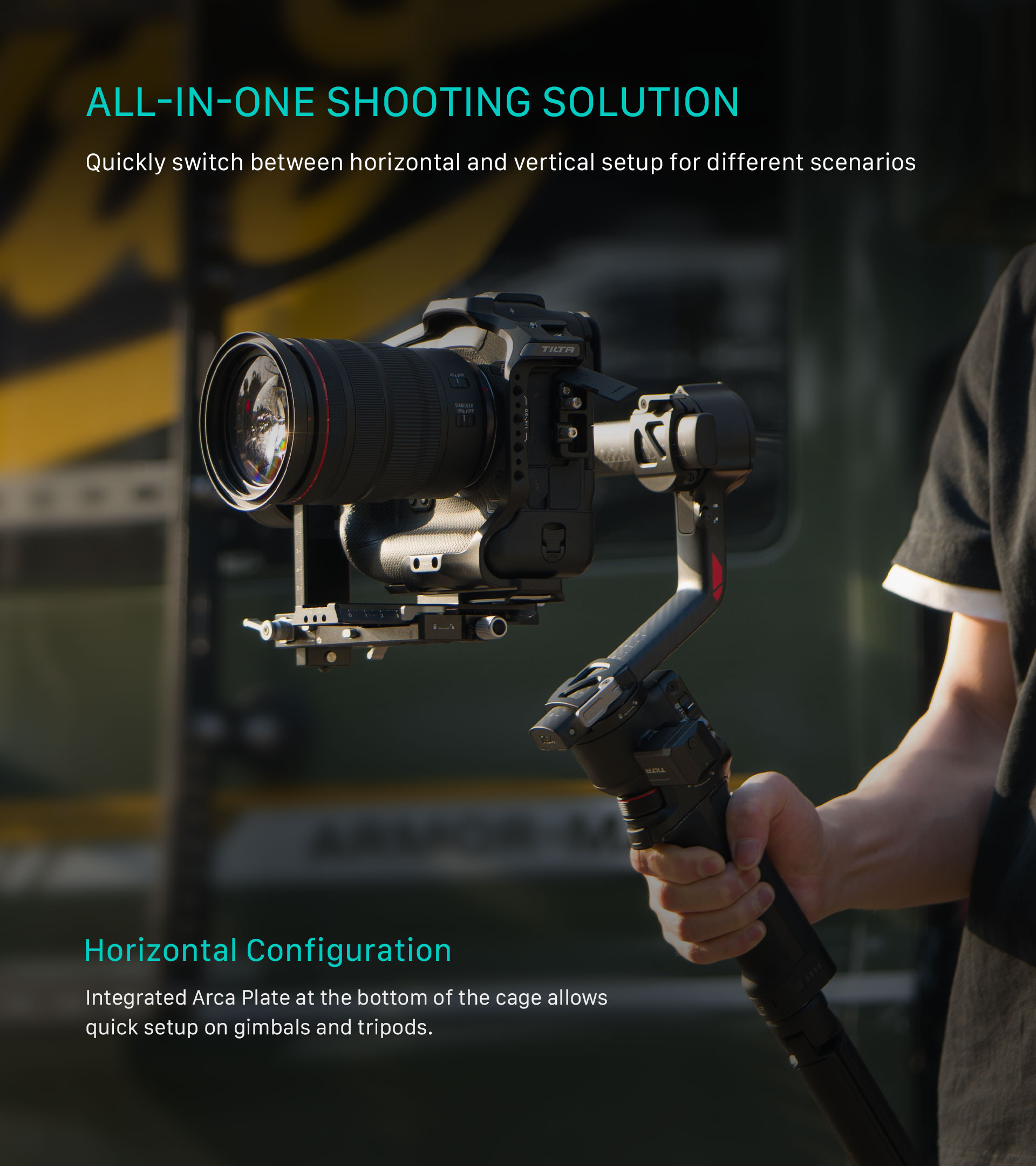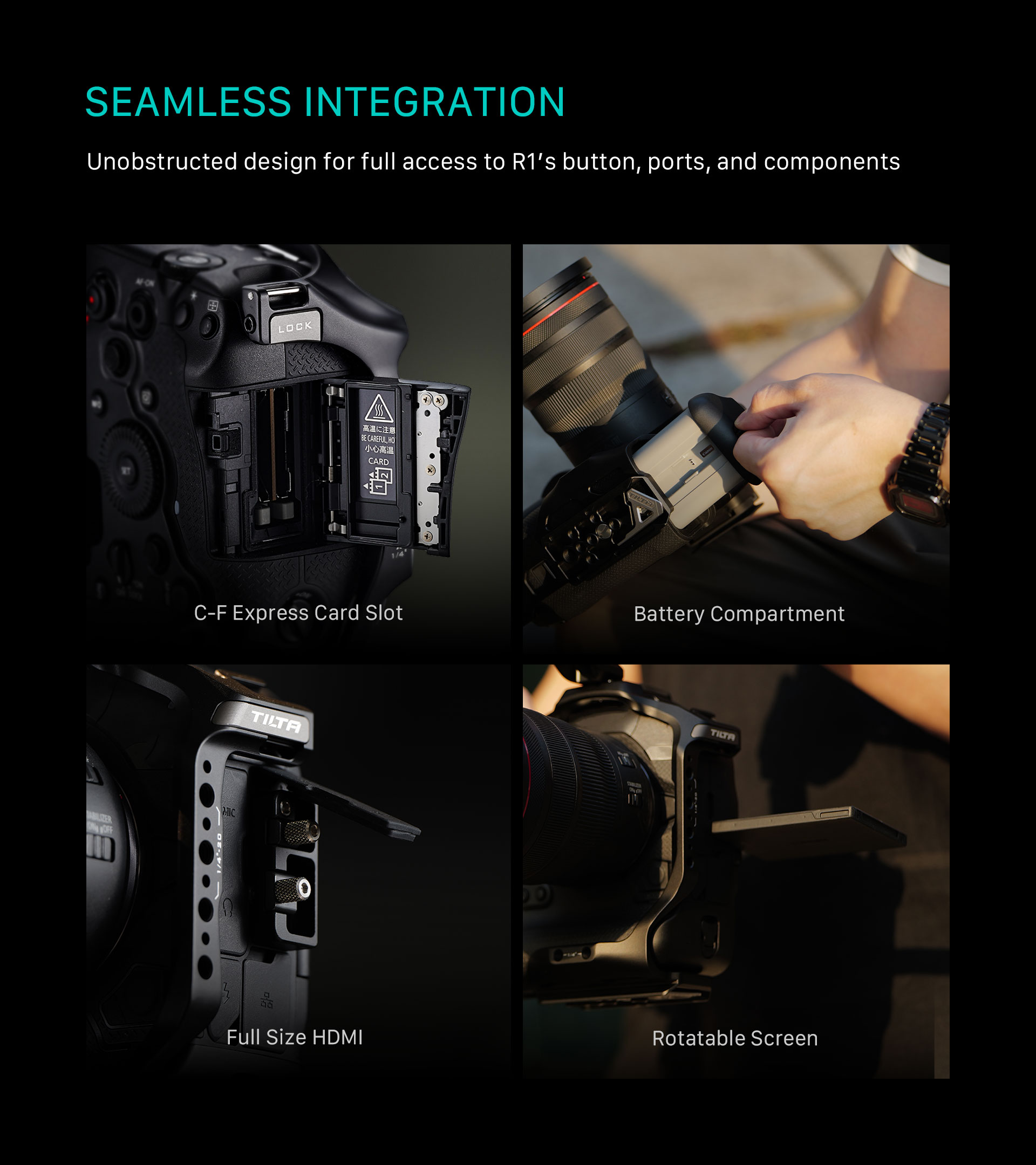 Predstavljamo celotno kletko za fotoaparat Canon R1. Zagotavlja dodatno zaščito ohišja fotoaparata, hkrati pa razširja možnosti pritrditve različnih dodatkov. Ta kletka za fotoaparat ima sprejemnik za hladno peto, nastavke za zapestni trak, navoj 1/4″-20 z lokacijskimi točkami in adapter za navoj 3/8″-16 na 1/4″-20.