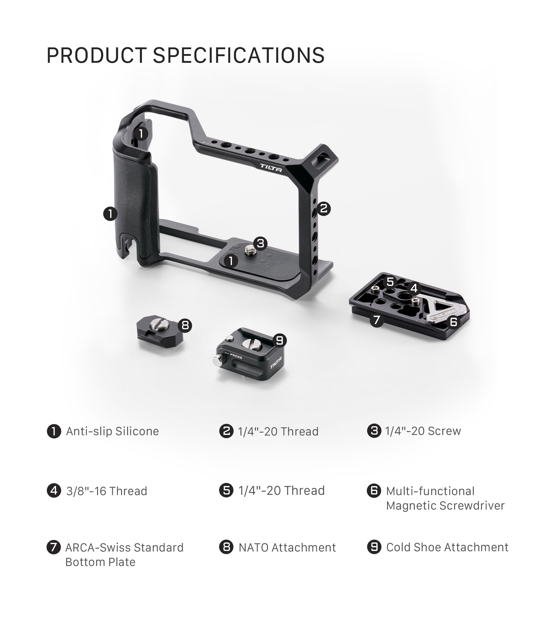 Ta ohišje kamere služi kot dodatna zaščita za ohišje kamere, hkrati pa omogoča namestitev široke palete zunanjih dodatkov prek več možnosti pritrditve, vključno s Cold Shoe Receiver, NATO Rail in ¼”-20 navojem z lokacijskimi točkami.