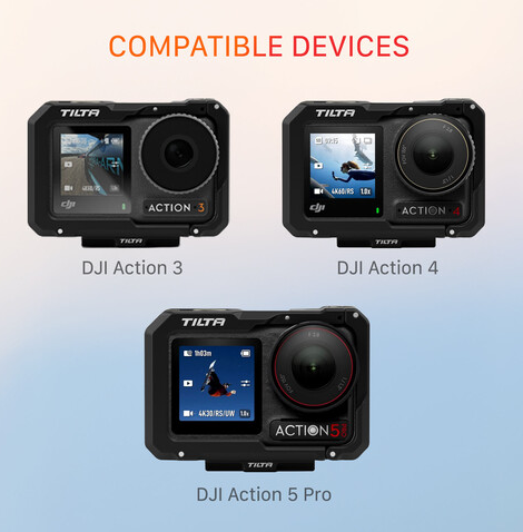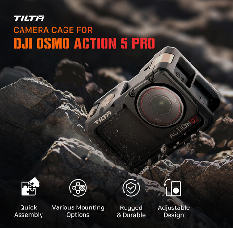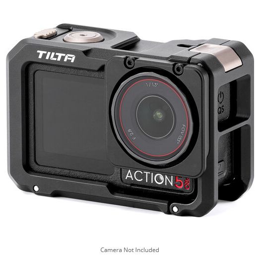 Tilta TA-T72-FCC-B Full Camera Cage (črna) je robusten, minimalističen zaščitni okvir za DJI Osmo Action 5 Pro/4/3, ki dodaja magnetno podporo za Tilta filter, dvojno stranico za hitro sprostitev za takojšnjo zamenjavo baterije, zgornji hladni čevelj, stranski 1/4"-20 navoj in popolno združljivost z magnetnimi osnovnimi ploščami Tilta – vse v trdnem 150 g magnezij-aluminijastem ohišju z vgrajenimi silikonskimi blazinicami za blaženje udarcev in brez oviranja vrat ali gumbov.