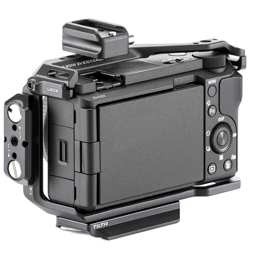 Tilta TA-T69-FCC-B Full Camera Cage (črna) je lahek, modularni aluminijasti oklepni sistem, ki je bil posebej izdelan za Sony ZV-E10 II in zagotavlja popolno zaščito z neomejenim dostopom do vrat, vgrajenim silikonskim ročajem, zgornjim/stranskim hladnim čevljem in NATO-tirnico, več navojev proti zvijanju 1/4"-20 in 3/8"-16, osnovo, združljivo z Arca-Swiss + DJI RS gimbalom, in odstranljivimi stranskimi/zgornjimi ploščami – vse to za samo 94 g za najboljšo opremo za vloganje.