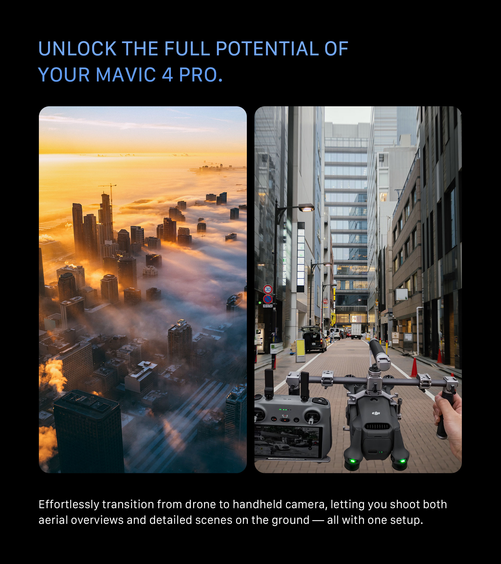 Ta posebej zasnovana kamera je idealna za filmarje, ustvarjalce vsebin in produkcijske ekipe, ki so veliko na poti, saj ponuja stabilno in ergonomsko rešitev za snemanje z Mavic 4 Pro na tleh.