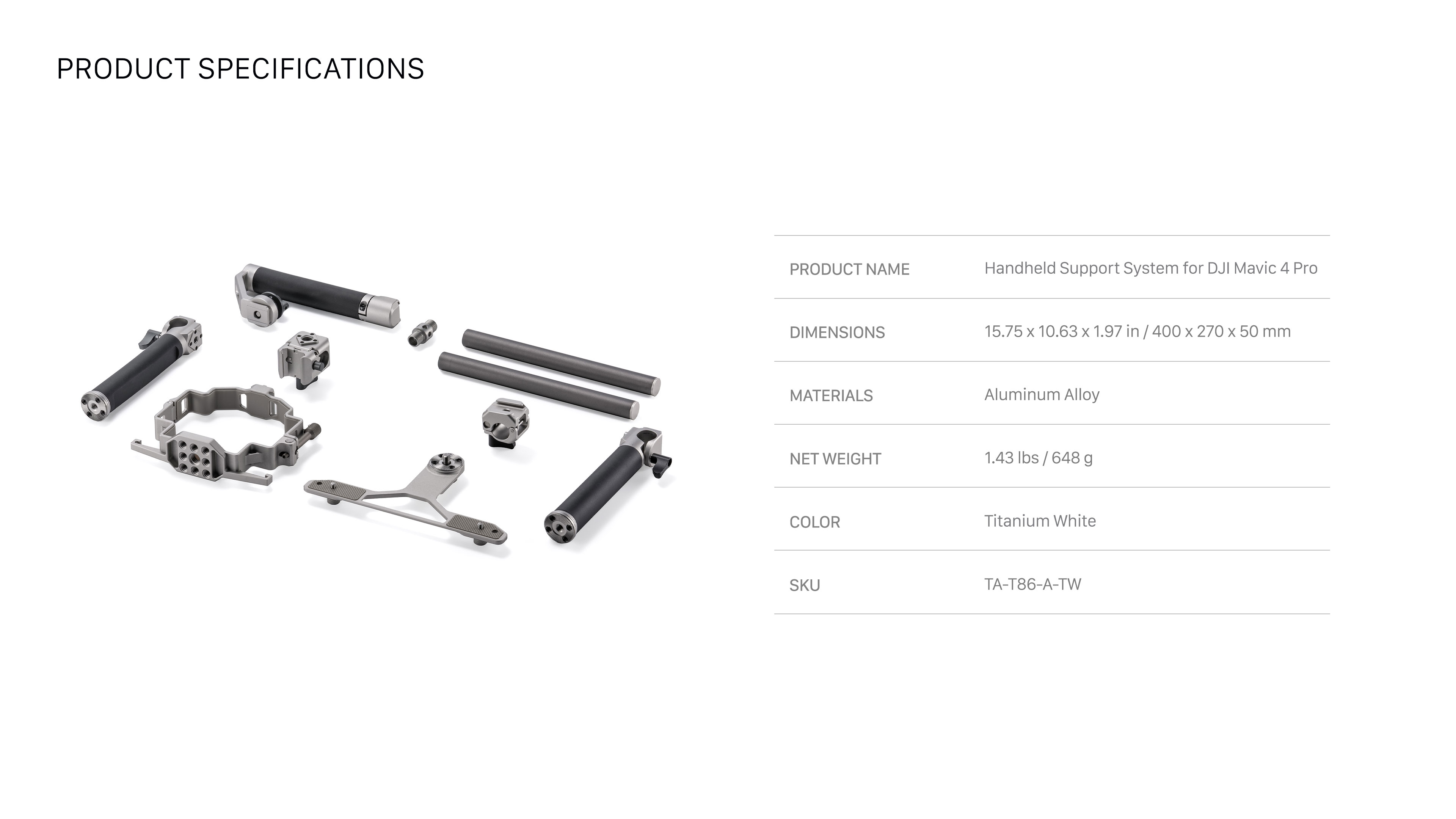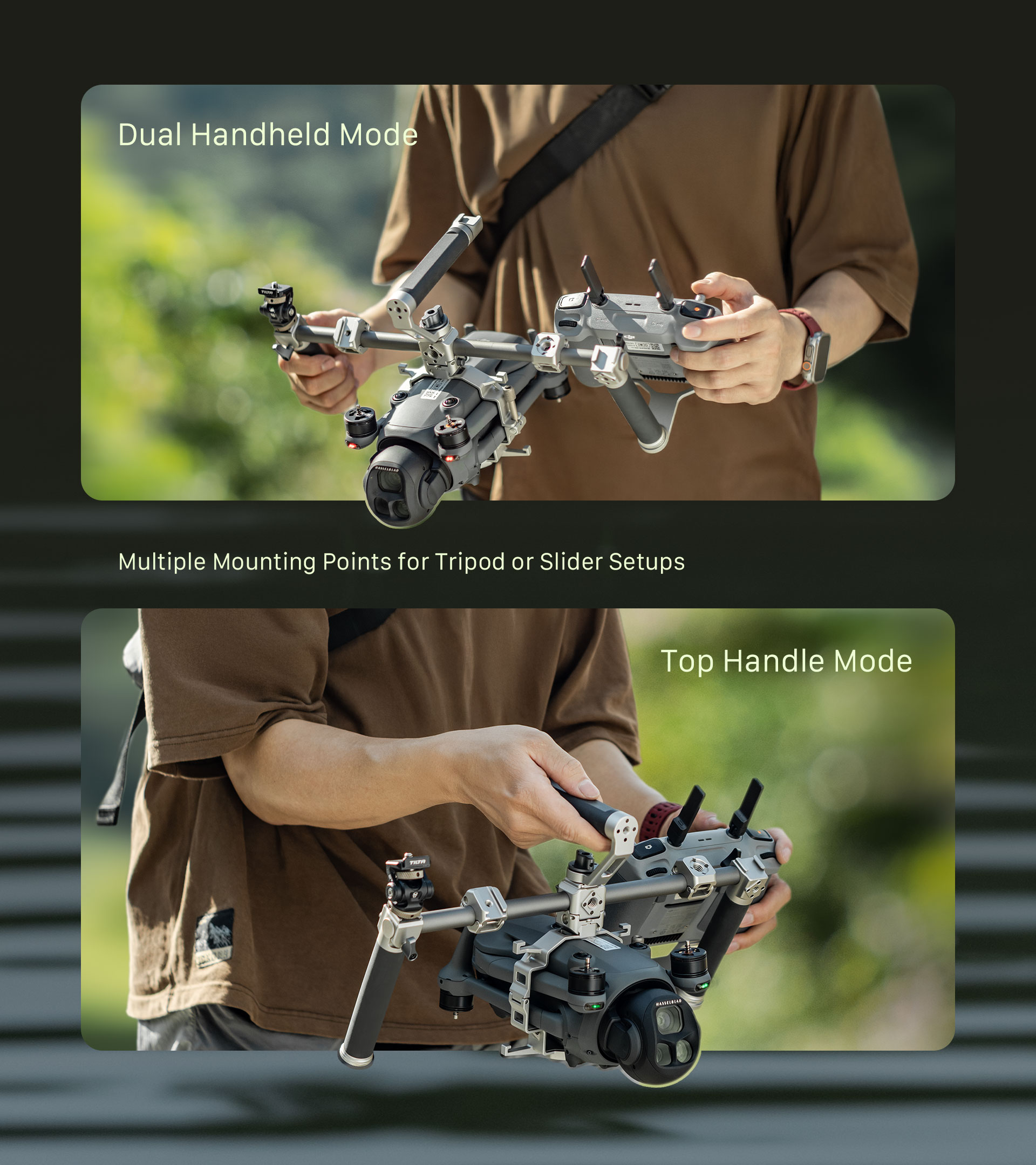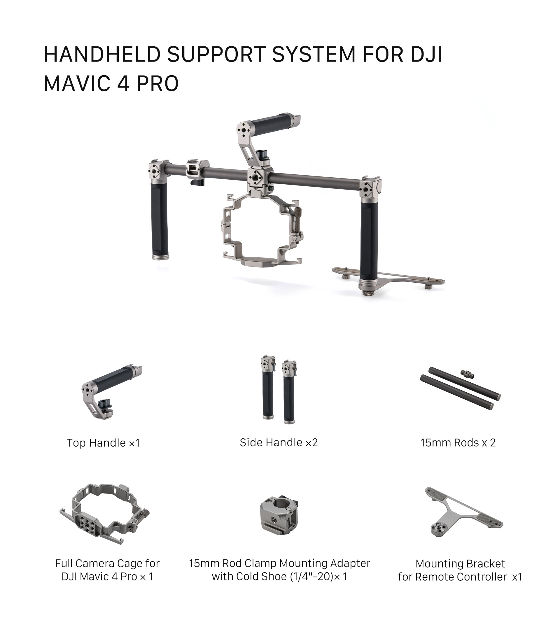 Ta ročni podporni sistem odpira nove ustvarjalne možnosti, saj vaš dron spremeni v popolnoma funkcionalno ročno kamero. Ta posebej zasnovana kamerska ohišje je idealno za filmarje, ustvarjalce vsebin in produkcijske ekipe, ki so veliko na poti, saj ponuja stabilno in ergonomsko rešitev za snemanje z Mavic 4 Pro s tal.