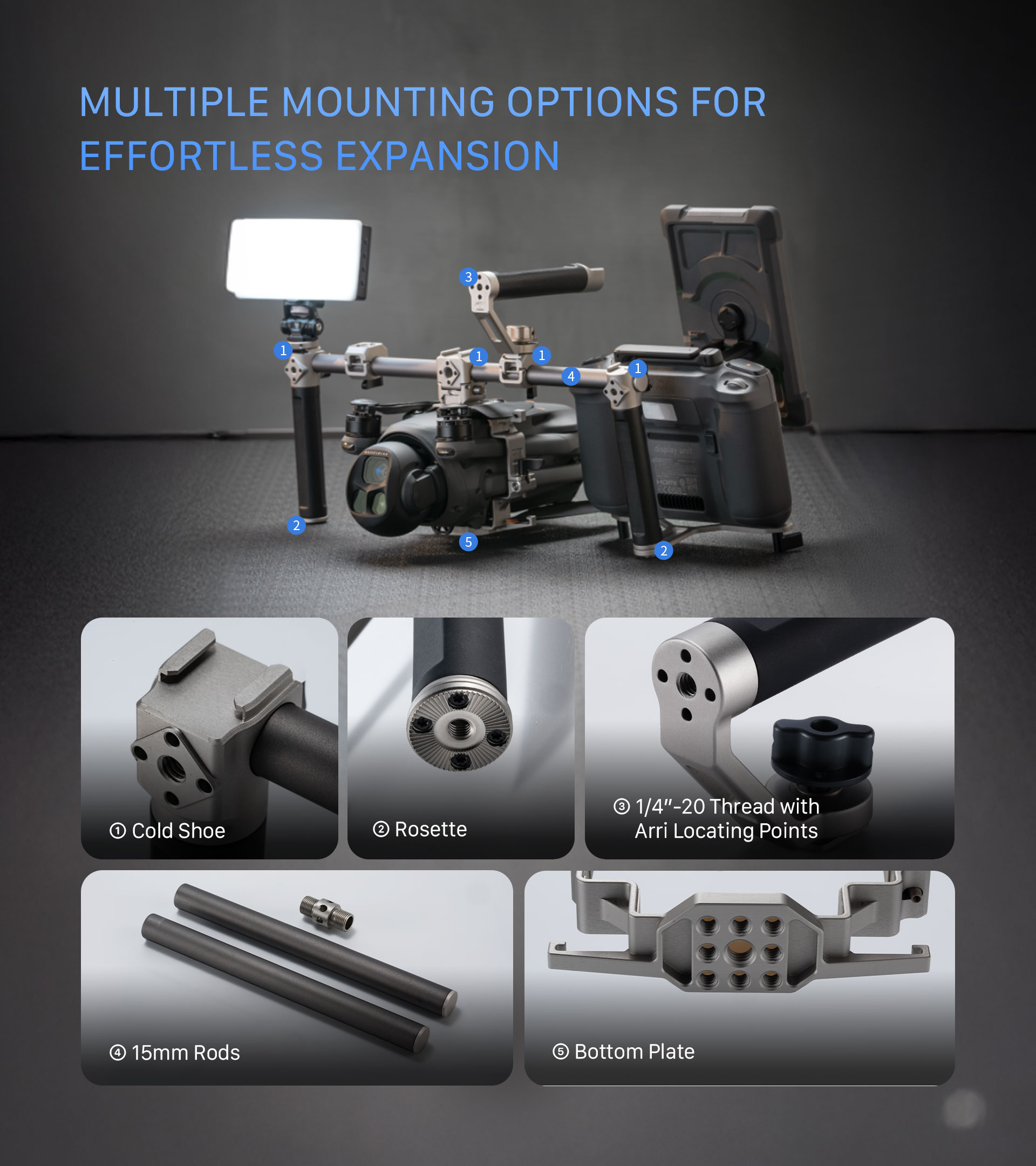 Dodatne pritrdilne točke, kot so sprejemnik Cold Shoe, 15-mm palica, rozeta in 1/4″-20 navoj z lokacijskimi točkami, razširjajo možnosti za pritrditev različne opreme, kot so vgrajene luči.