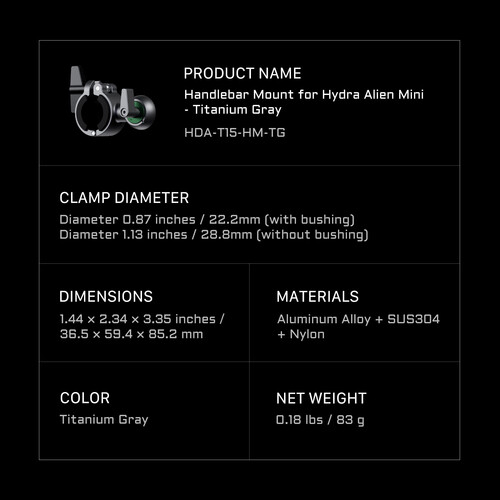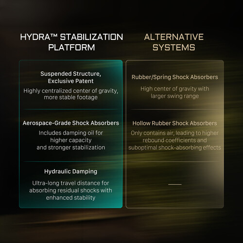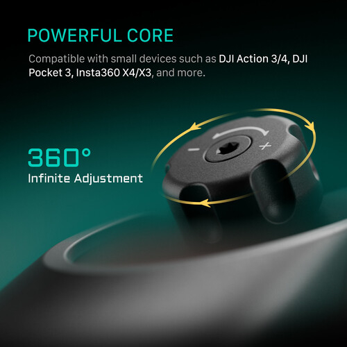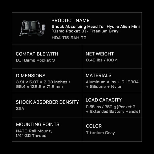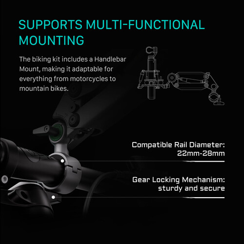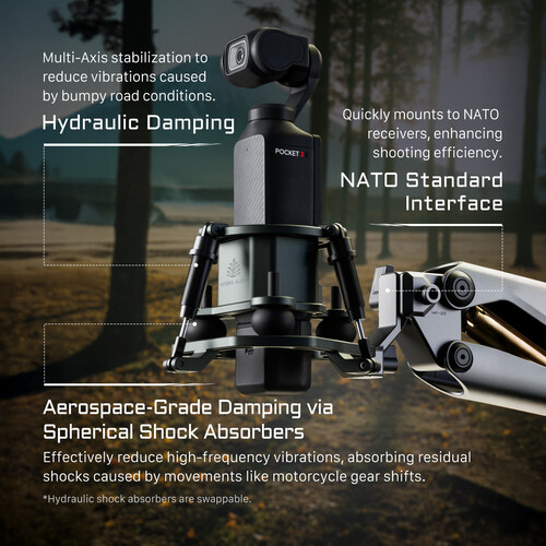 Večosna stabilizacijska platforma Hydra™ dodatno izolira visokofrekvenčne vibracije in zagotavlja nemoteno snemanje tudi na razgibanem terenu. Glava, ki absorbira udarce, je optimizirana za DJI Osmo Pocket 3, medtem ko nosilec na krmilu podpira premera 22,2 mm in 28,8 mm, zaradi česar se lahko prilagodi različnim vrstam vozil.