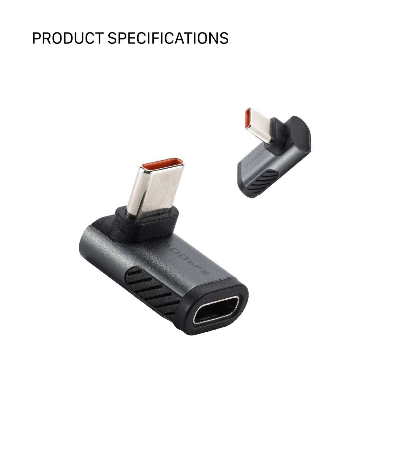 Adapter ima univerzalno zasnovo in je združljiv z večino USB-C vrat in dodatkov, kar ga naredi vsestranskega za naprave, kot so pametni telefoni, kamere in prenosni računalniki. 90-stopinjski kotni konektor zagotavlja večjo prilagodljivost, zmanjšuje napetost kabla in omogoča čiste, brez napetosti povezave v tesnih prostorih ali prenatrpanih napravah.