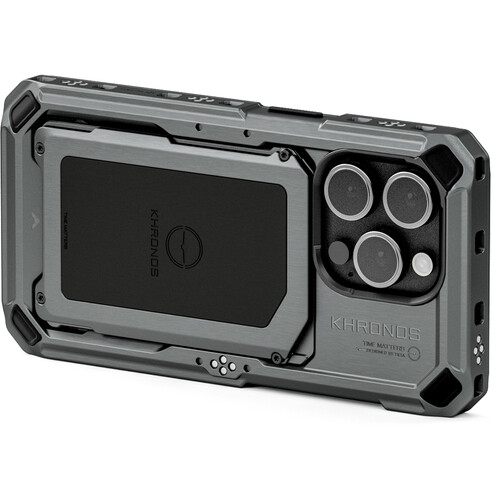 Prostorsko sivo ohišje Khronos Mobile Filmmaking Case za iPhone 15 Pro podjetja Tilta je zasnovano tako, da zagotavlja kinematografske rezultate za profesionalne in osebne video projekte. Kot jedro ekosistema Khronos podpira vrsto dodatne opreme, vključno z adapterjem za objektiv za iPhone, pladnjem za hitri filter in različnimi filtri, ki se pritrdijo z zaklepno sponko in devetimi lastnimi pritrdilnimi točkami. Ohišje ima elektronske kontaktne točke za prenos napajanja na določene nastavke, kot je napajalni ročaj Khronos, s čimer se povečajo možnosti vrhunskih fotoaparatov iPhona 15.