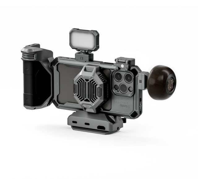 Predstavljamo komplet Khronos Ultimate Kit za iPhone 15 Pro / Pro Max, naslednjo generacijo mobilnega snemanja. To ohišje za pametni telefon, ki je skrbno zasnovano za oba modela telefona iPhone 15 in navdihnjeno s kletko za fotoaparat, ponuja neprimerljivo kombinacijo funkcionalnosti in elegance. Ohišje Khronos, izdelano za zaščito telefona pred vsakodnevno obrabo, ponuja zanesljivo zaščito, ne da bi pri tem ogrožalo slog ali funkcionalnost. Za namestitev so potrebni štirje vijaki, ki poskrbijo, da ohišje in vsi priključeni dodatki ostanejo varno pritrjeni.
