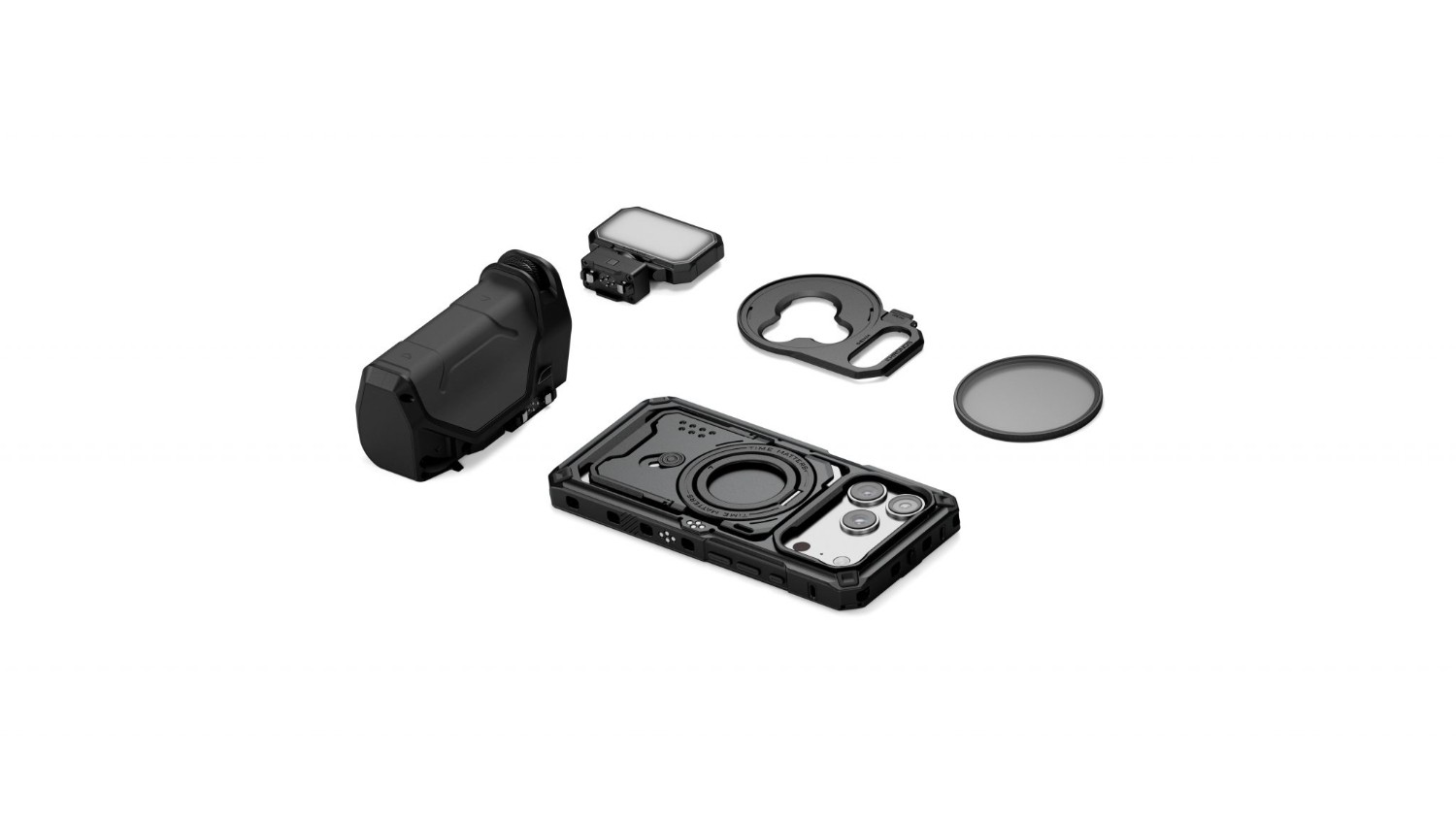 Tilta Khronos iPhone 17 Pro Street Snap Kit v črni barvi je profesionalni mobilni filmski komplet, zasnovan za iPhone 17 Pro. Vključuje Bluetooth-nadzorovano ročico Focus PD z vgrajeno baterijo, mini LED-panel z uravnoteženo dnevno svetlobo in nastavljivo svetlostjo ter magnetni 58-mm polarizator s filtrom za razpršitev črne megle, vse vgrajeno v zaščitni sistem kletke s hitrim sprostilnim mehanizmom.