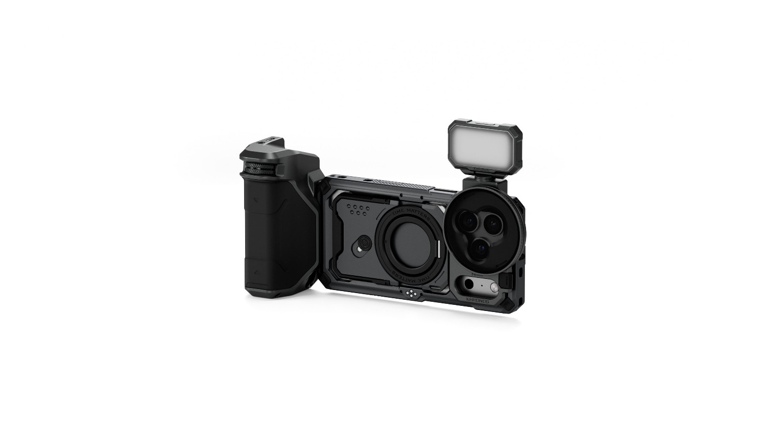 Khronos Pro Case: Ta ohišje, ki je navdihnjeno s kamero, je osnova kompleta in ima zasnovo s hitrim sprostilnim zapiranjem za enostavno namestitev in odstranitev. Zagotavlja zanesljivo zaščito in je izdelano z integriranimi elektronskimi kontaktnimi točkami, ki prenašajo moč iz ročaja neposredno na nameščene dodatke.