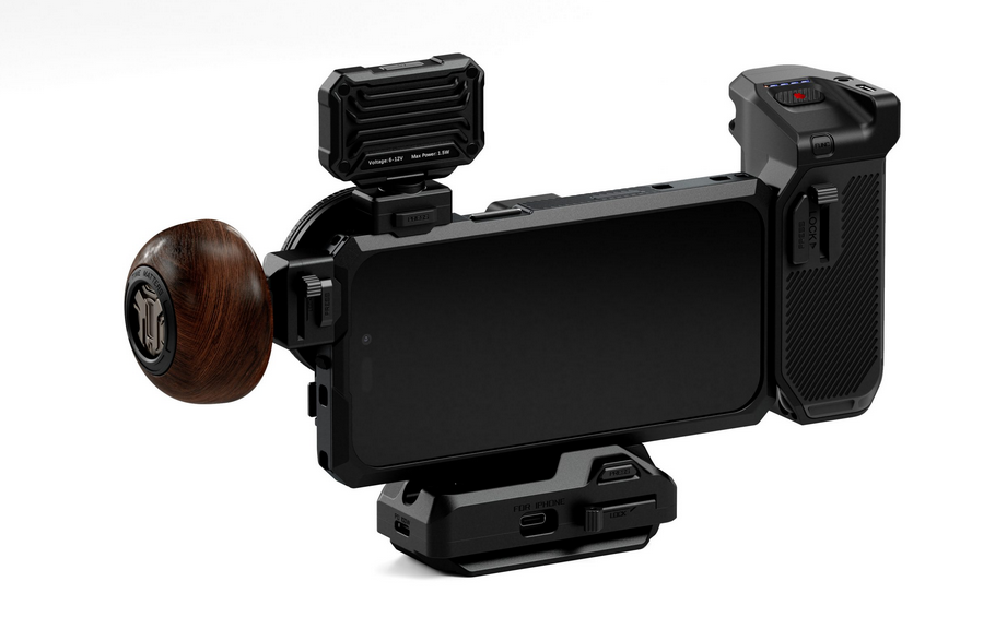 Tilta Khronos iPhone 17 Pro Ultimate Kit vaš pametni telefon spremeni v celovit kinematografski sistem. Narejen je posebej za iPhone 17 Pro (in Pro Max), njegova osnova pa je robustno ohišje Khronos s hitrim zapiranjem in vgrajenimi elektronskimi kontaktnimi točkami za prenos energije skozi ohišje na pritrjene dodatke.