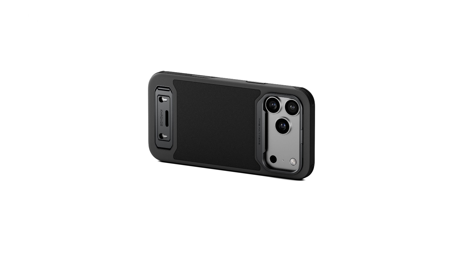 Tilta Khronos Lite Case v črni barvi je lahek, profesionalni zaščitni etui za iPhone 17 Pro Max. Ima vgrajeno stojalo za prostoročno gledanje, magnetno zadnjo ploščo za pritrditev dodatkov in okrepljeno zaščito za kamero in vogale.