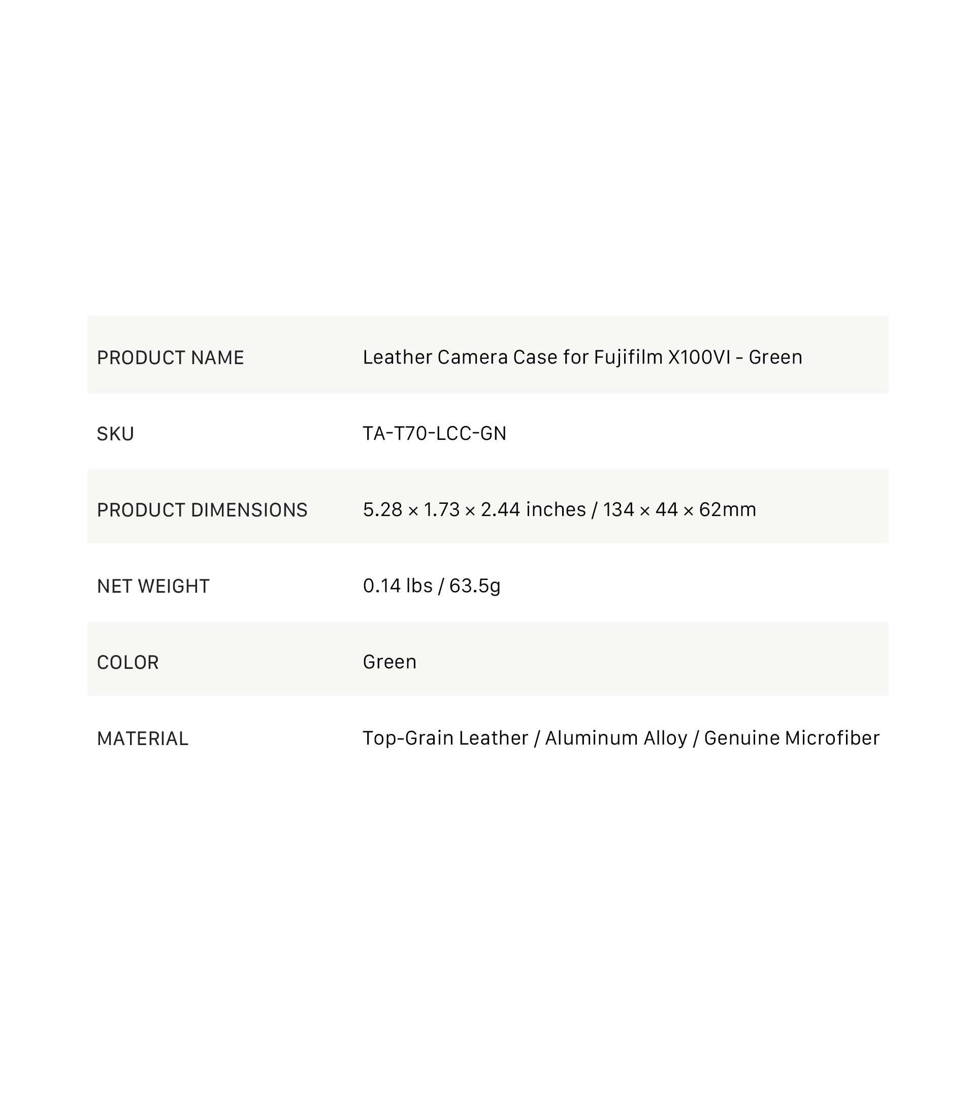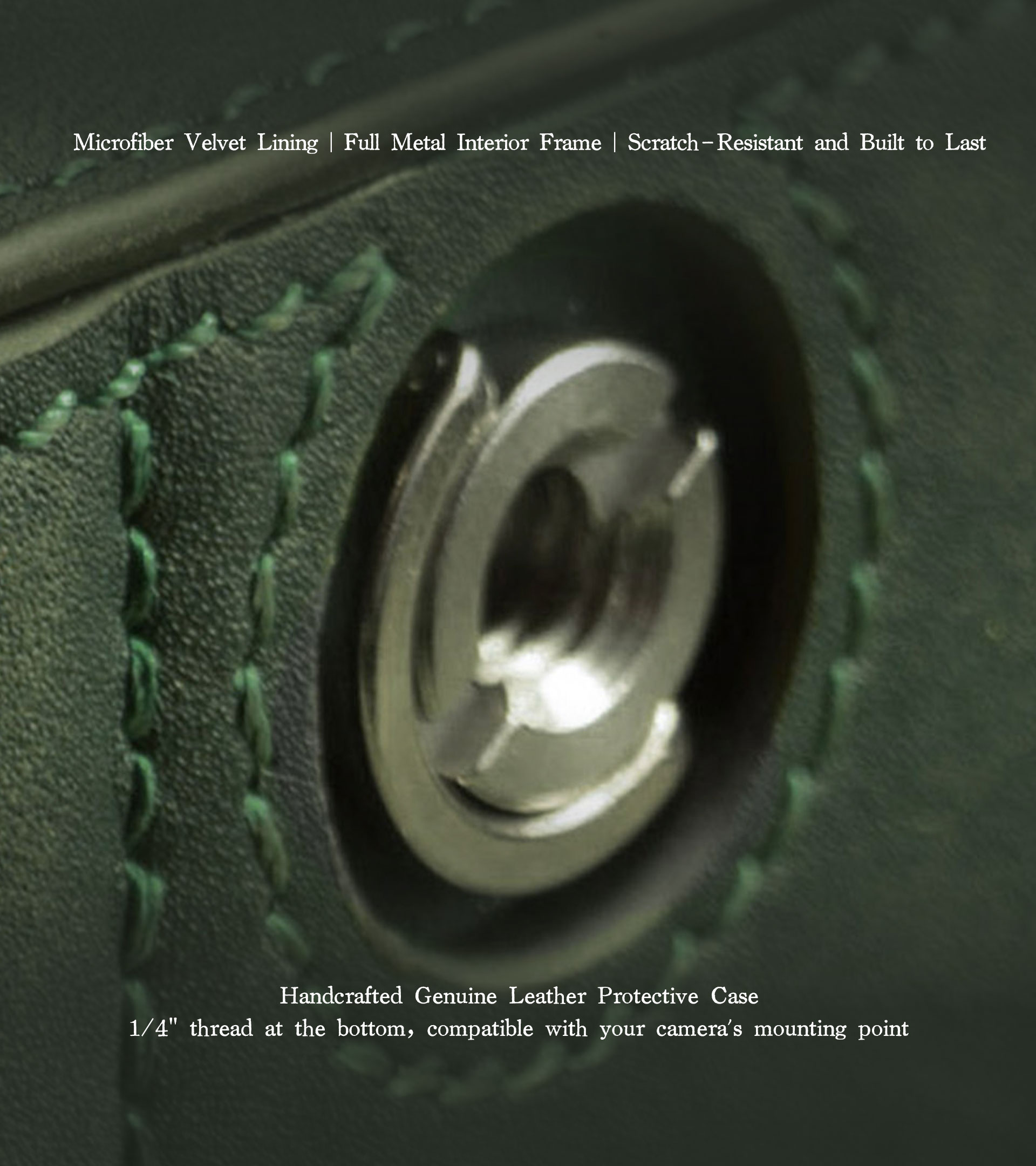 Predstavljamo usnjeno ohišje za fotoaparat Fujifilm X100VI. To ohišje se pritrdi z vijakom 1/4″-20 in uporabnikom omogoča udobnejše upravljanje in rokovanje s telesom fotoaparata prek vgrajenega ročaja. Zasnova zagotavlja tudi dodatno zaščito spodnjega dela ohišja fotoaparata, kar je še posebej uporabno pri odlaganju fotoaparata.
