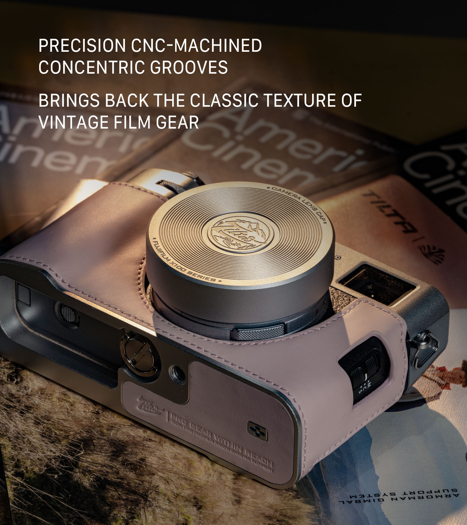 Ta pokrovček objektiva, izdelan z natančno obdelavo CNC, ima natančno izdelane koncentrične utore, ki dajejo otipljiv, teksturiran občutek in spominjajo na klasično eleganco starinskih filmskih fotoaparatov.