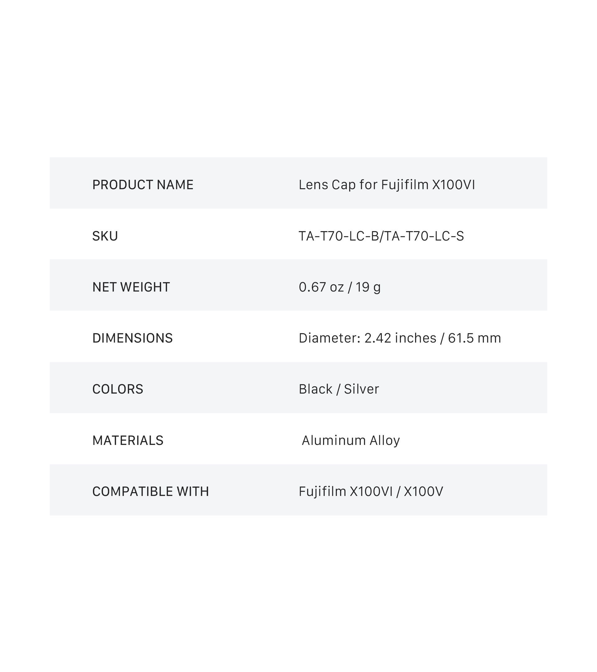 Zaščitite svoj fotoaparat Fujifilm X100VI ali X100V v slogu z našim vrhunskim pokrovčkom za objektiv, v katerem se sodobna izdelava združuje s starinskim šarmom. Ta lahka, a trpežna kapica tehta le 0,67 unče (19 g) in je zasnovana tako, da se brezhibno prilega objektivu fotoaparata in ga ščiti.