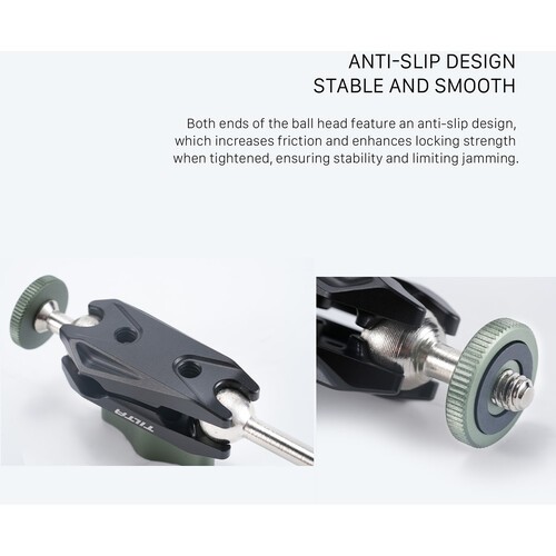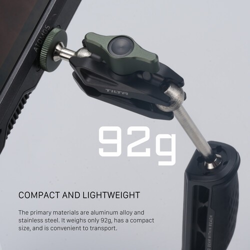 Tilta Micro Articulating Arm je idealna oprema za filmarje, ki potrebujejo majhne dodatke za svojo kamero z možnostjo prilagodljivega pozicioniranja. Ta 5,2-palčni artikulirani ročaj je izdelan iz visokokakovostne aluminijeve zlitine in nerjavečega jekla, kar zagotavlja močno in zanesljivo podporo za vašo opremo z največjo nosilnostjo 5 funtov (2,3 kg). Rokav ima na vsakem koncu 1/4"-20 moški vijak, zaradi česar je združljiv z široko paleto dodatkov, kot so monitorji na kameri, iskala in majhne dodatne luči. Oblika vključuje dve artikulacijski točki za enostavno in natančno pozicioniranje v edinstvenih kotih. Ena stran ročaja je nekoliko daljša, da se izogne oviranju drugih dodatkov, ki so že nameščeni na vaši opremi. Zaradi lahke oblike , ki tehta le 92 g, in kompaktne velikosti ga lahko enostavno dodate v katero koli torbo za kamero.