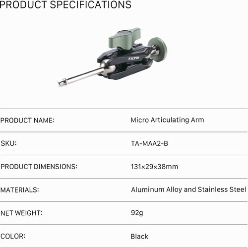 Tilta Micro Articulating Arm je kompakten in vsestranski 5,2-palčni ročaj, zasnovan za pritrditev dodatkov, kot so monitorji ali luči, na vašo kamero. Izdelan je iz trpežne aluminijeve zlitine in jekla, na vsakem koncu ima 1/4"-20 vijak in nosilnost 5 funtov.