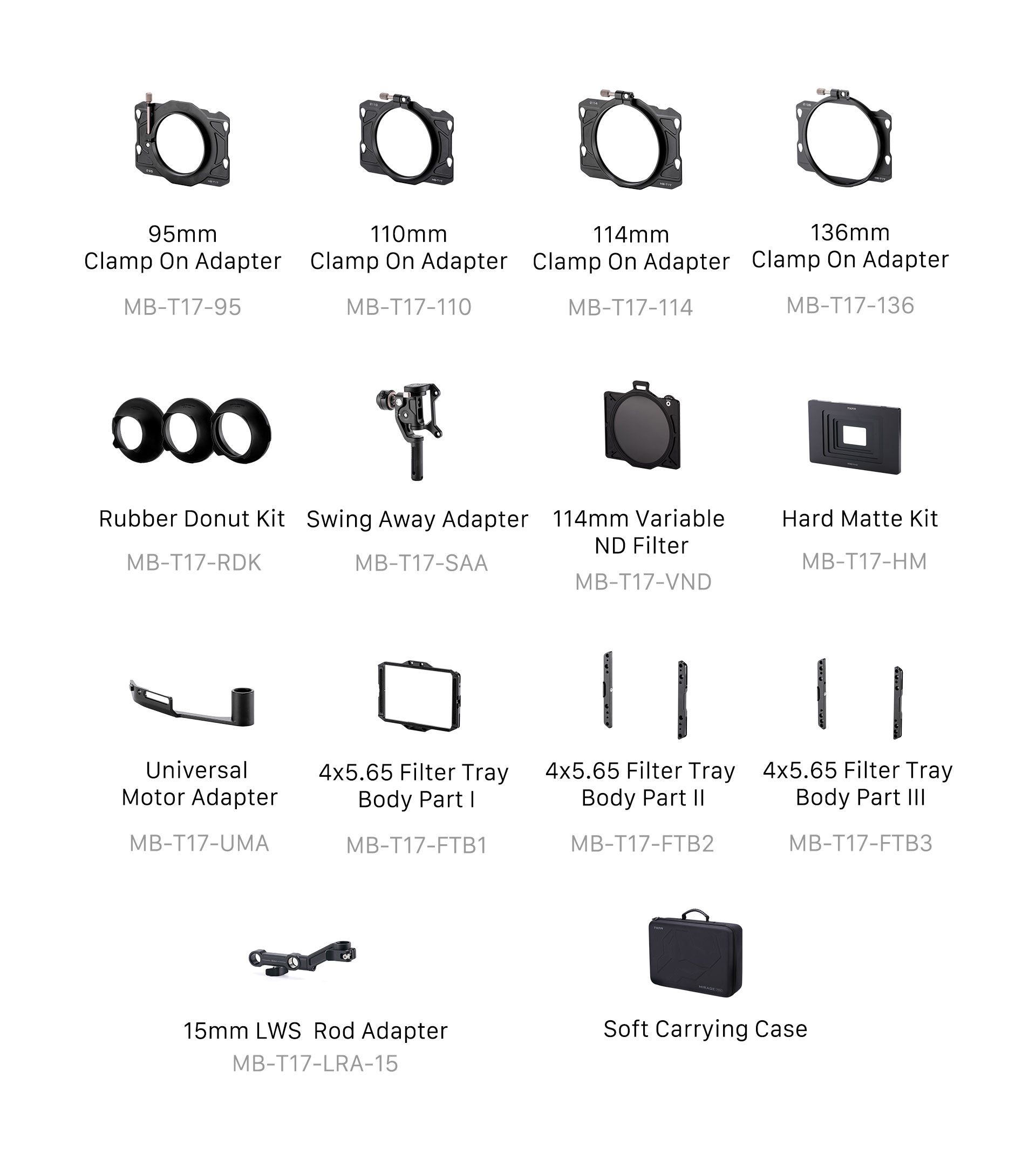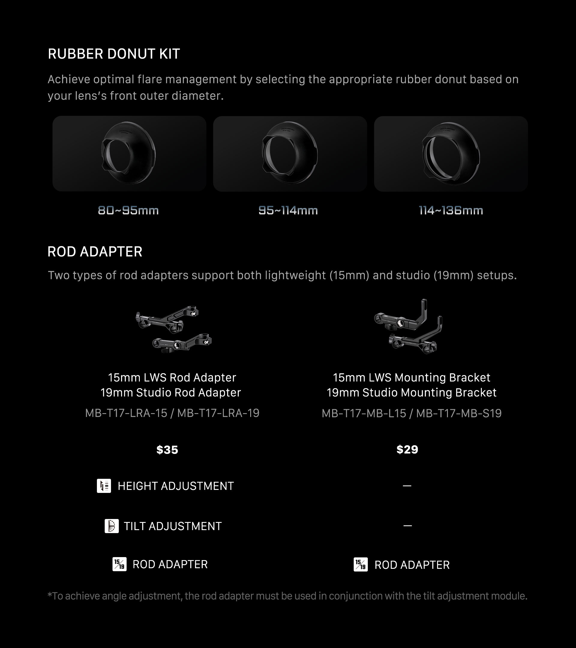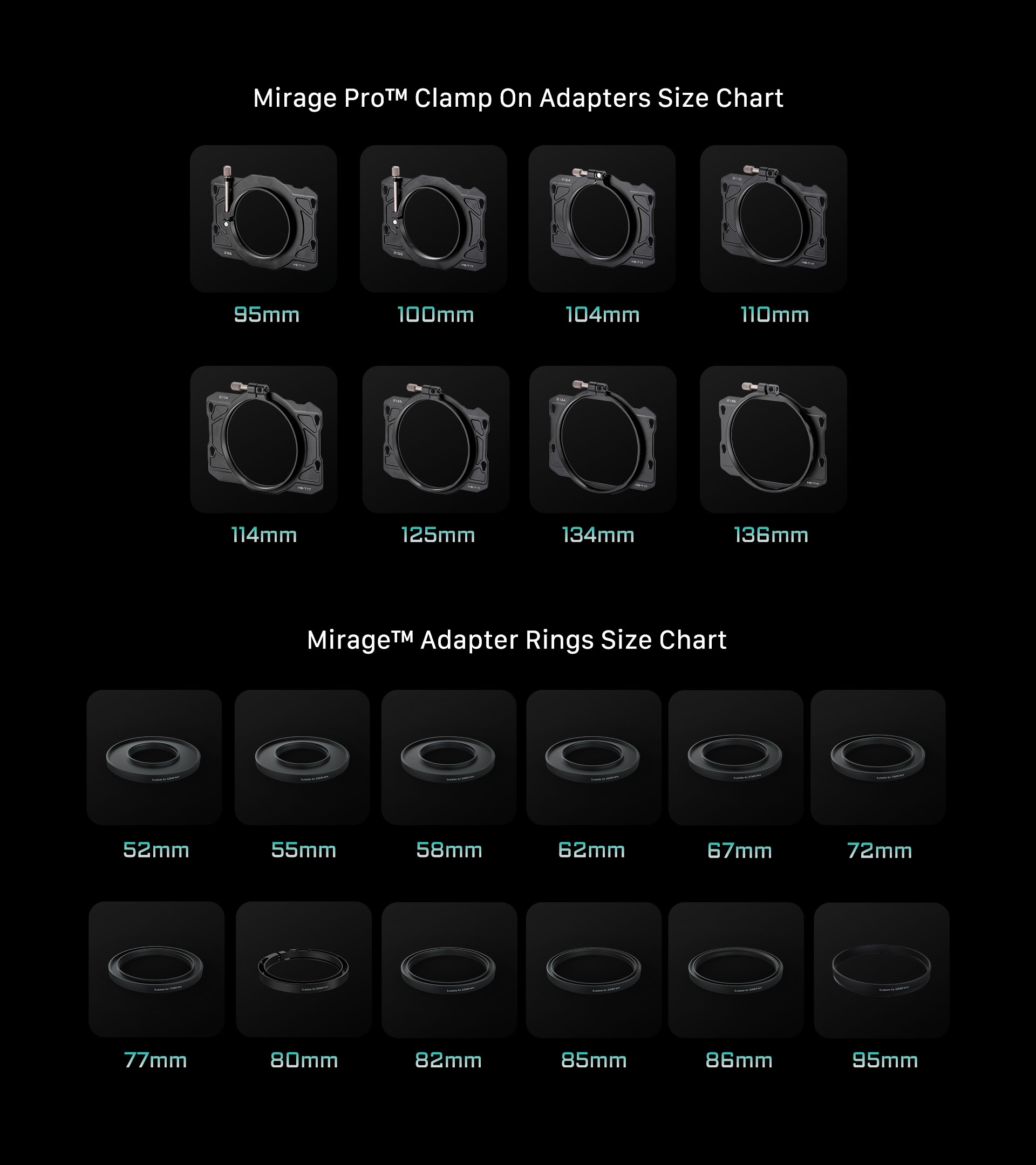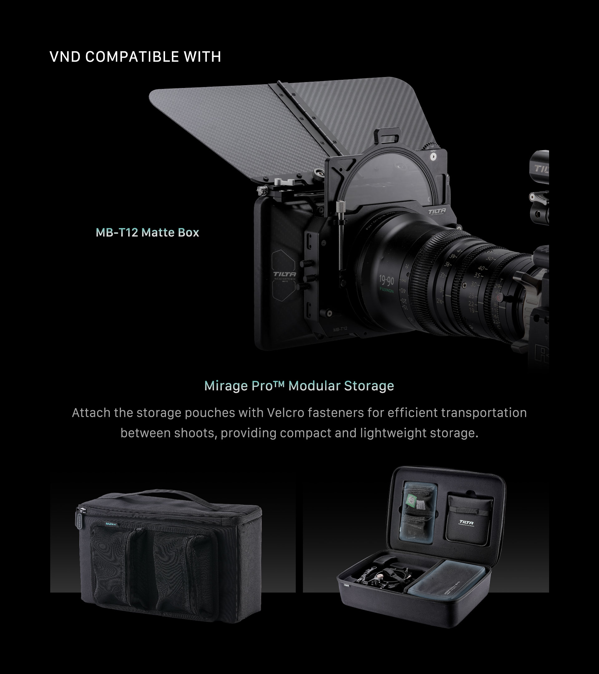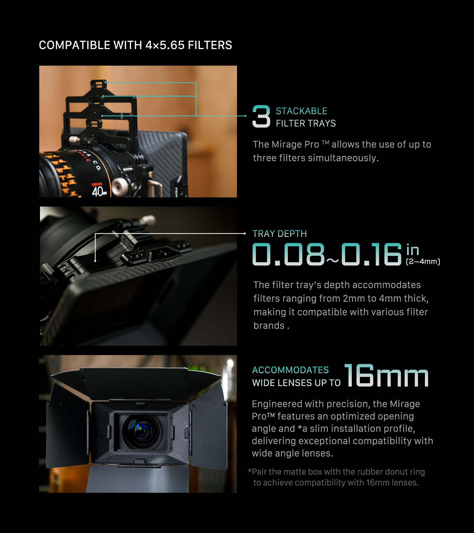 S pozornostjo do podrobnosti izdelan matte box Mirage Pro je vpenjalni matte box, zasnovan za različne velikosti objektivov, saj podpira objektive z zunanjimi premeri 95 mm, 110 mm, 114 mm in 134 mm ter fotografske objektive z naslednjimi nastavki za navoje filtrov: 67 mm, 72 mm, 77 mm, 82 mm.