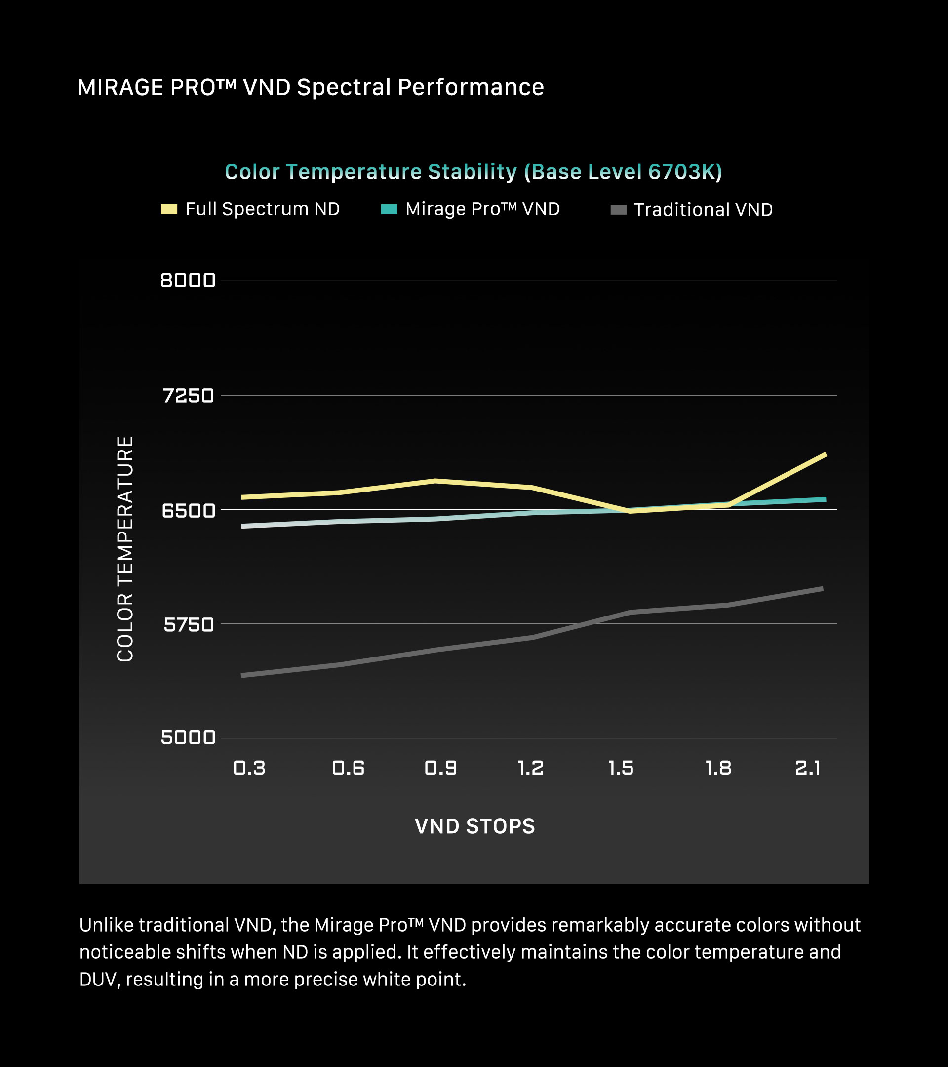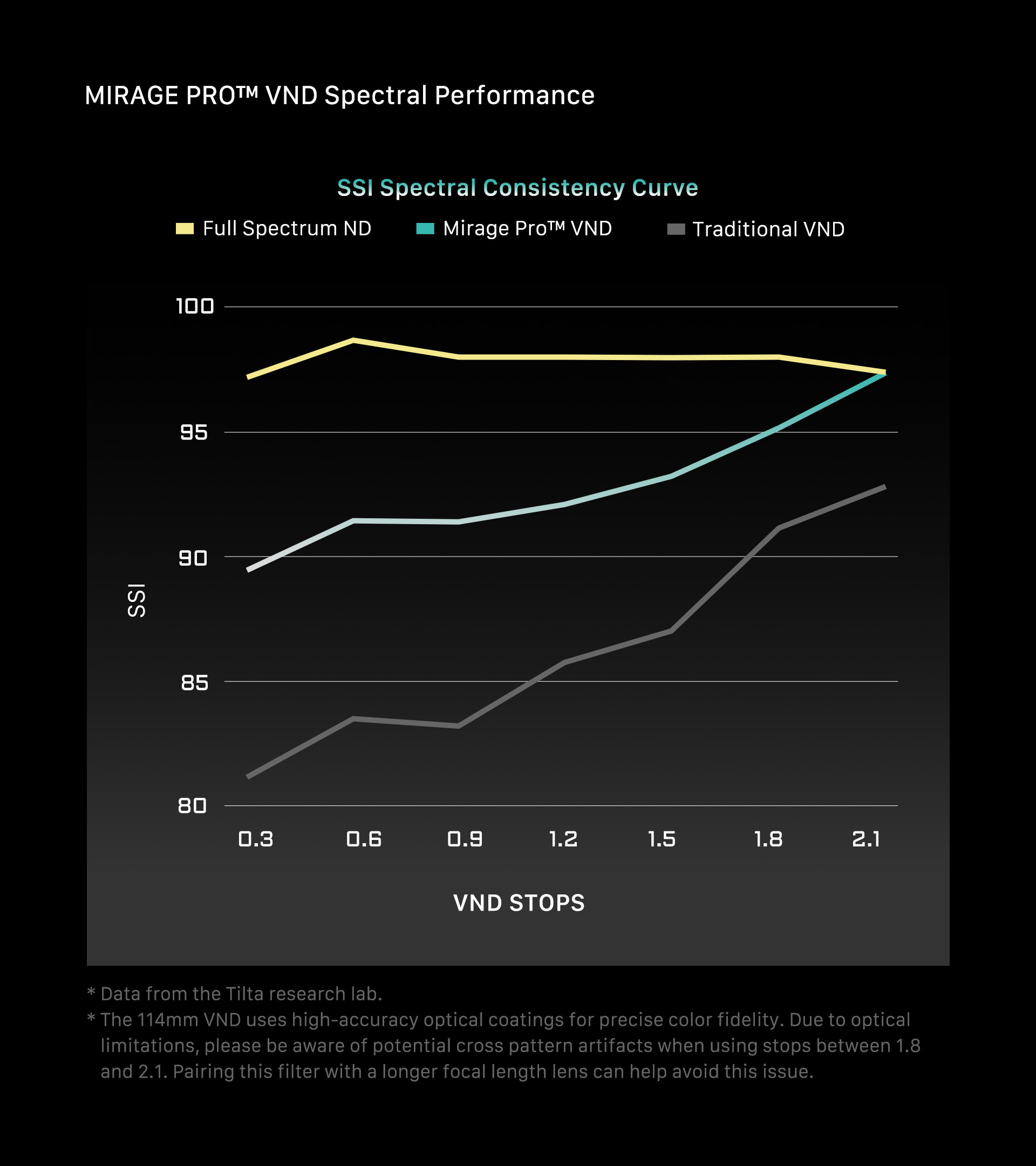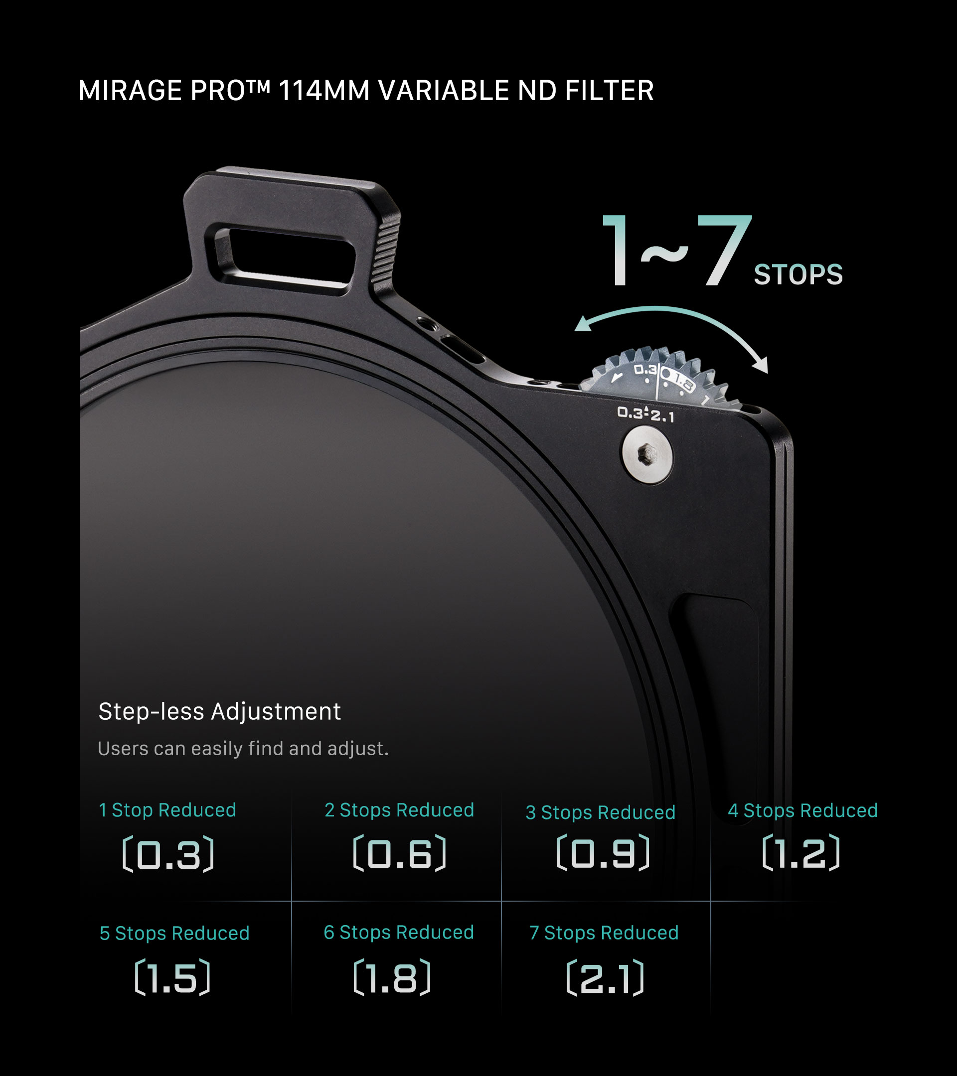 Komplet VND vključuje 114-milimetrski spremenljivi filter ND, ki zmanjša svetlobo za 1 do 7 stopenj. To uporabnikom omogoča enostaven in natančen nadzor ekspozicije.