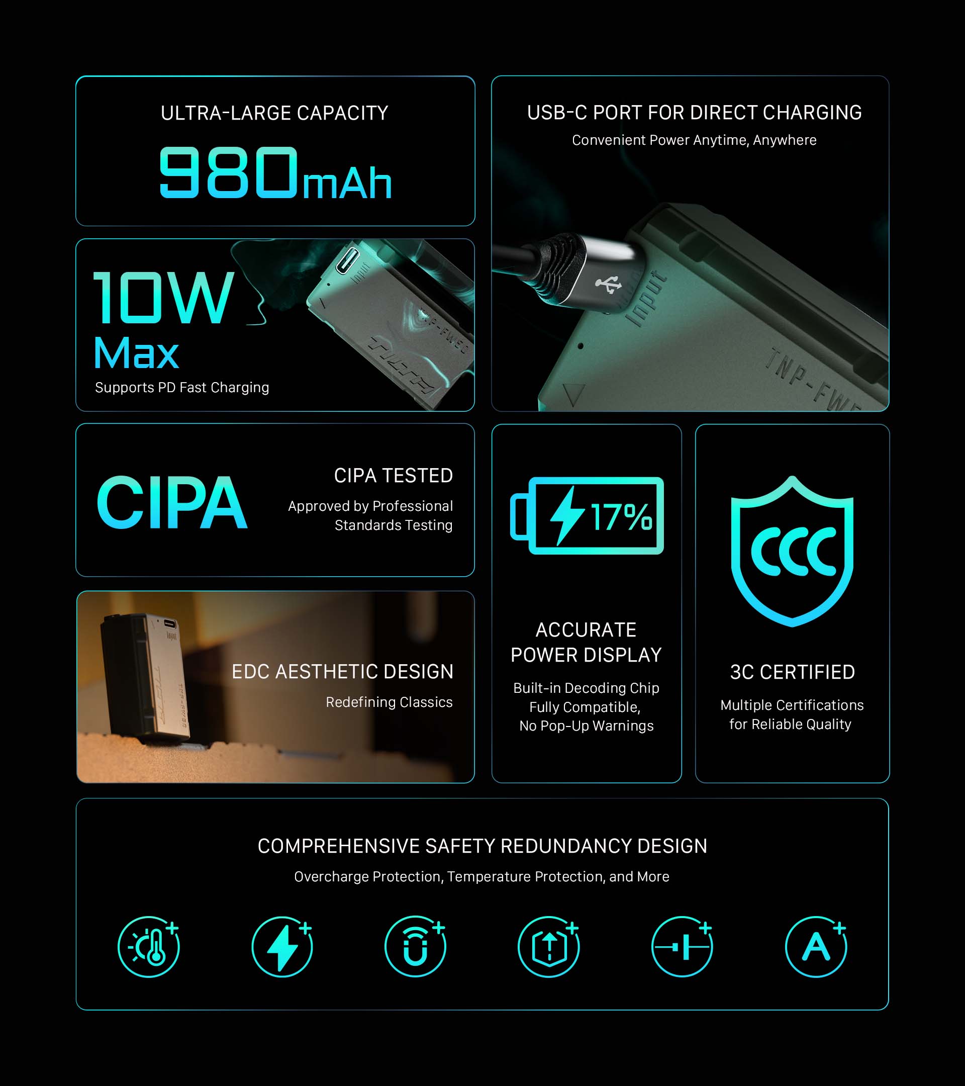 Z dimenzijami, ki ustrezajo izvirniku, se brezhibno prilega vašemu fotoaparatu in zagotavlja popolno združljivost. Opremljena je tudi s številnimi mednarodnimi varnostnimi certifikati (CCC, FCC, CE, PSE, KC, UL, BSMI), ki zagotavljajo mir in zanesljivo zaščito.