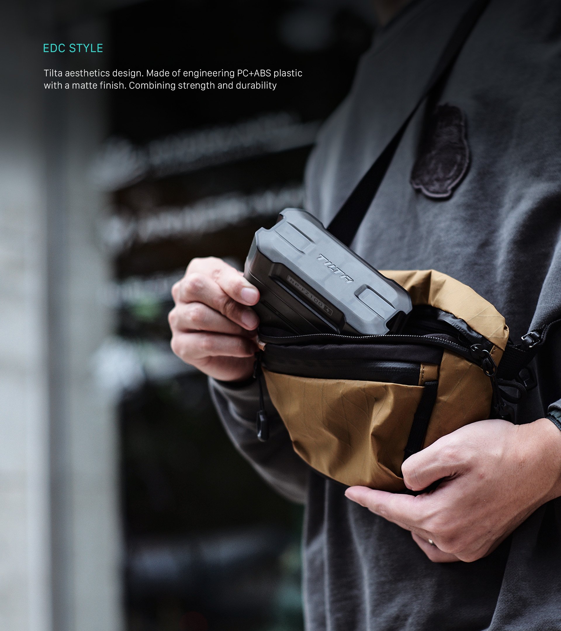 Prenosno polnilno postajo Tilta odlikuje zasnova v slogu EDC s Tiltino značilno estetiko, zato je eleganten in funkcionalen dodatek k vaši opremi.