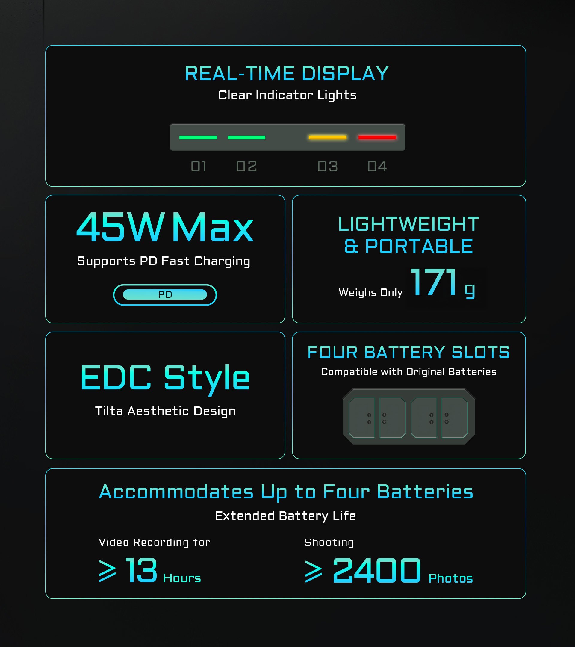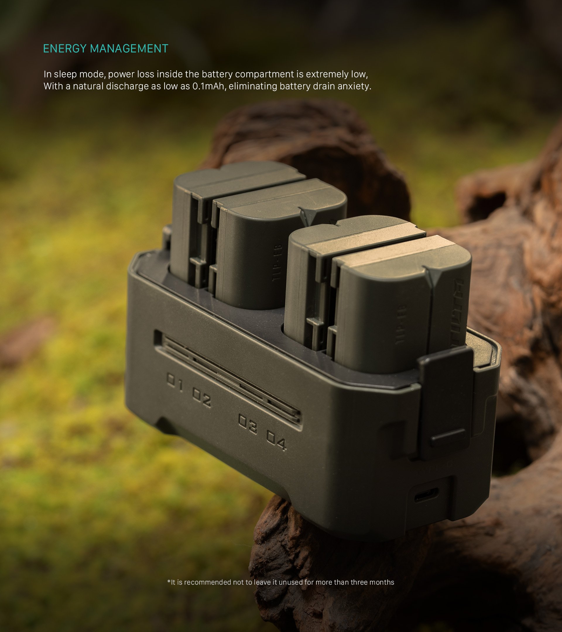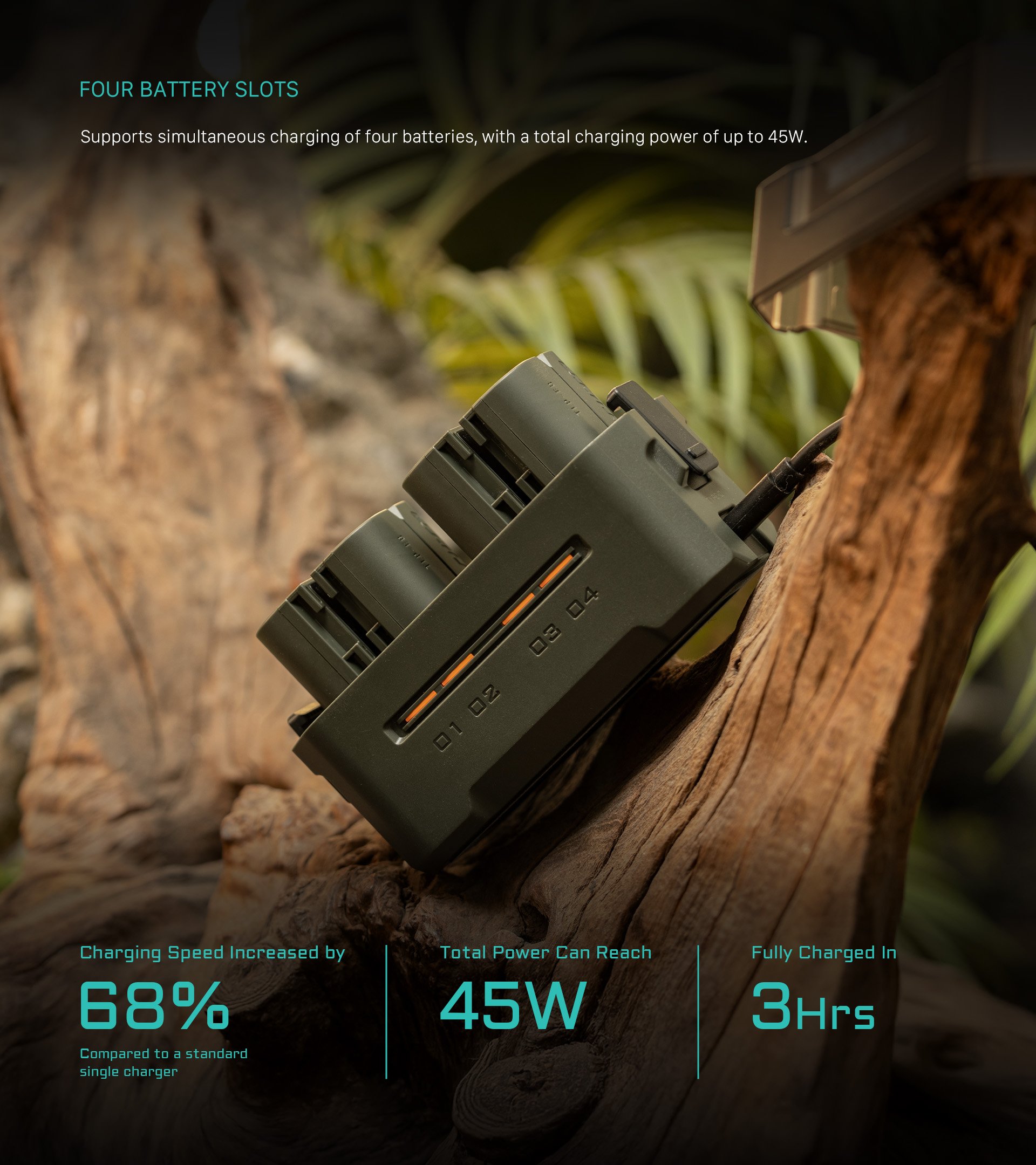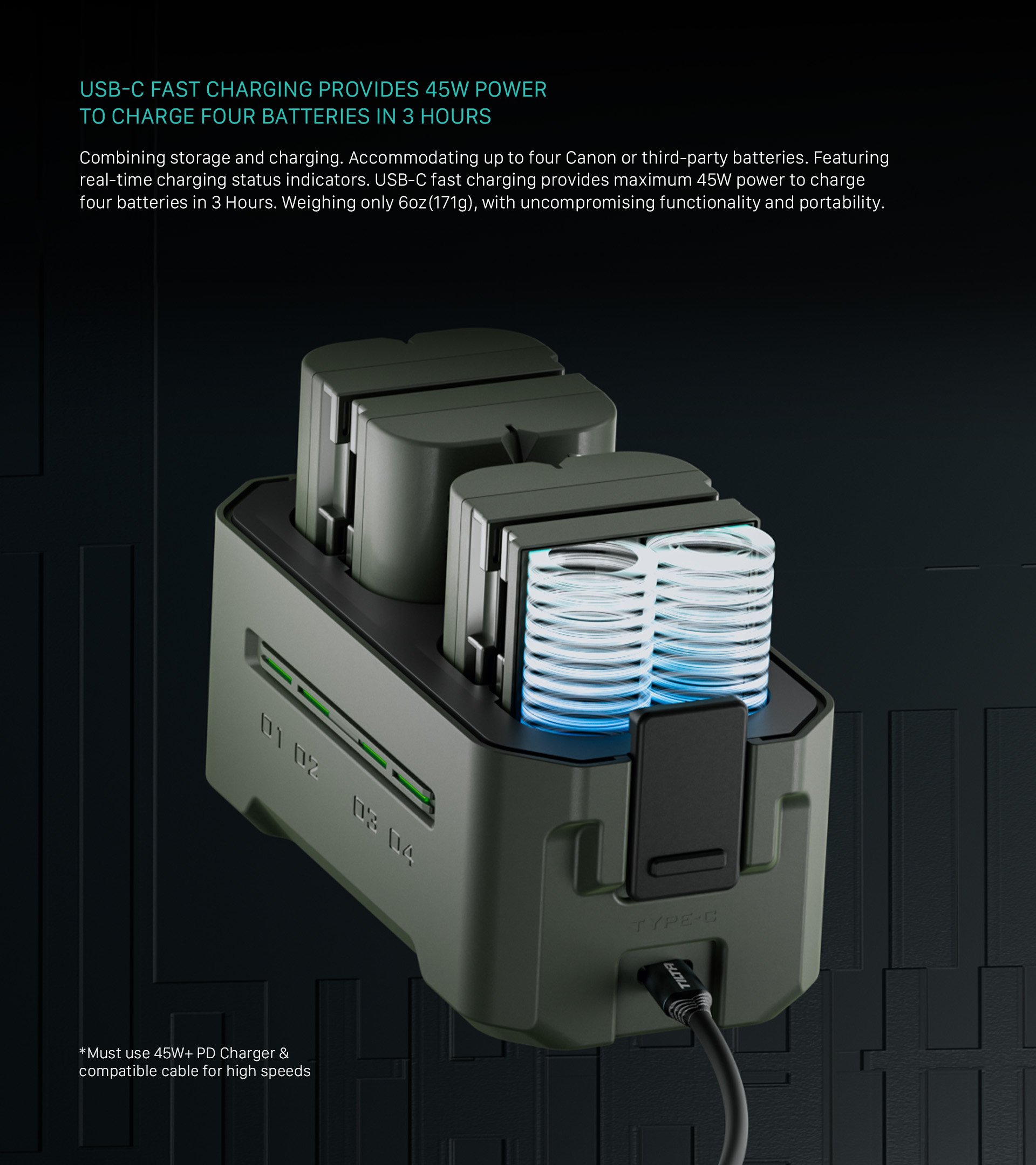 Ta kompaktna polnilna postaja je zasnovana za Canonove baterije LP-E6 in baterije drugih proizvajalcev ter ponuja štiri reže za enostavno polnjenje in priročno shranjevanje. Opremljena je s 45W hitrim polnjenjem PD in zagotavlja impresivno 68 % večjo hitrost polnjenja kot standardni enojni polnilnik, tako da so baterije pripravljene na akcijo v samo 3 urah.