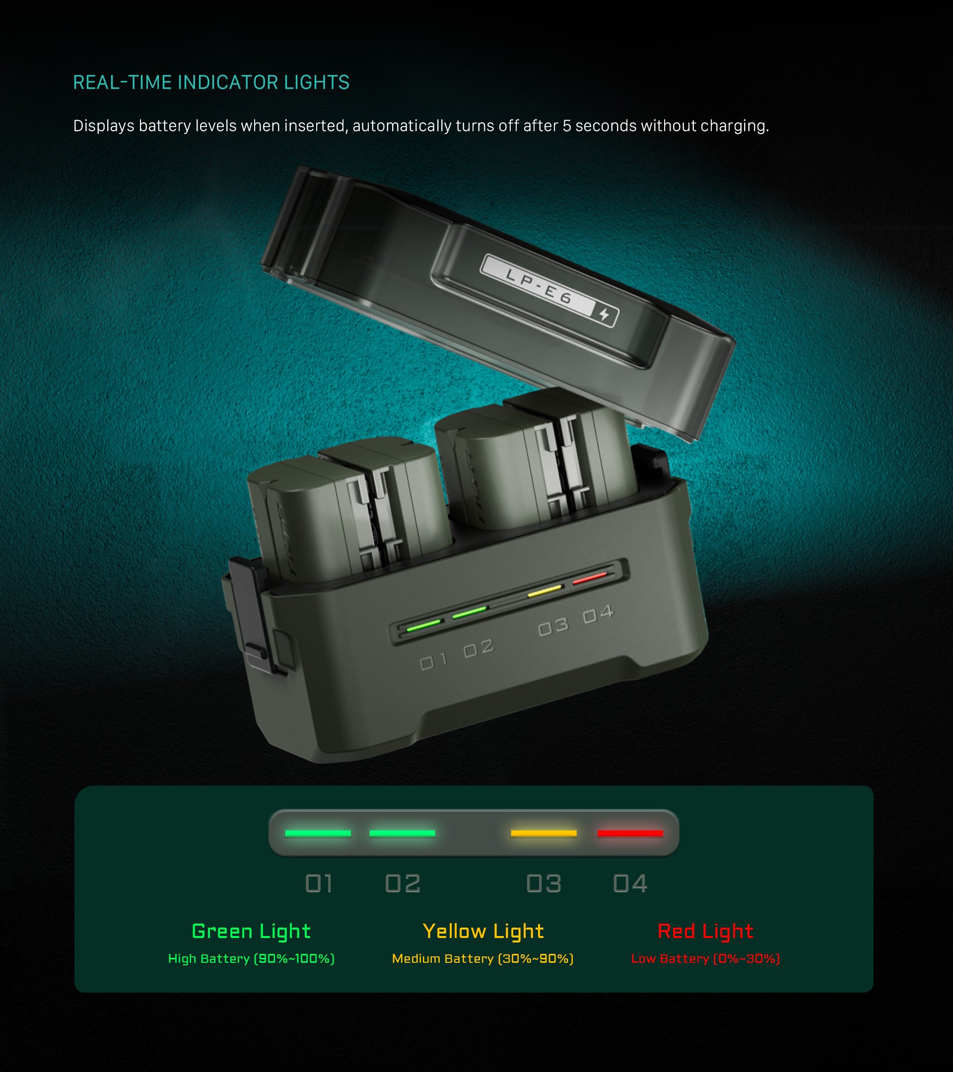 Ta kompaktna polnilna postaja je zasnovana za podporo Canonovih baterij LP-E6 in baterij drugih proizvajalcev ter ponuja štiri reže za enostavno polnjenje in priročno shranjevanje.