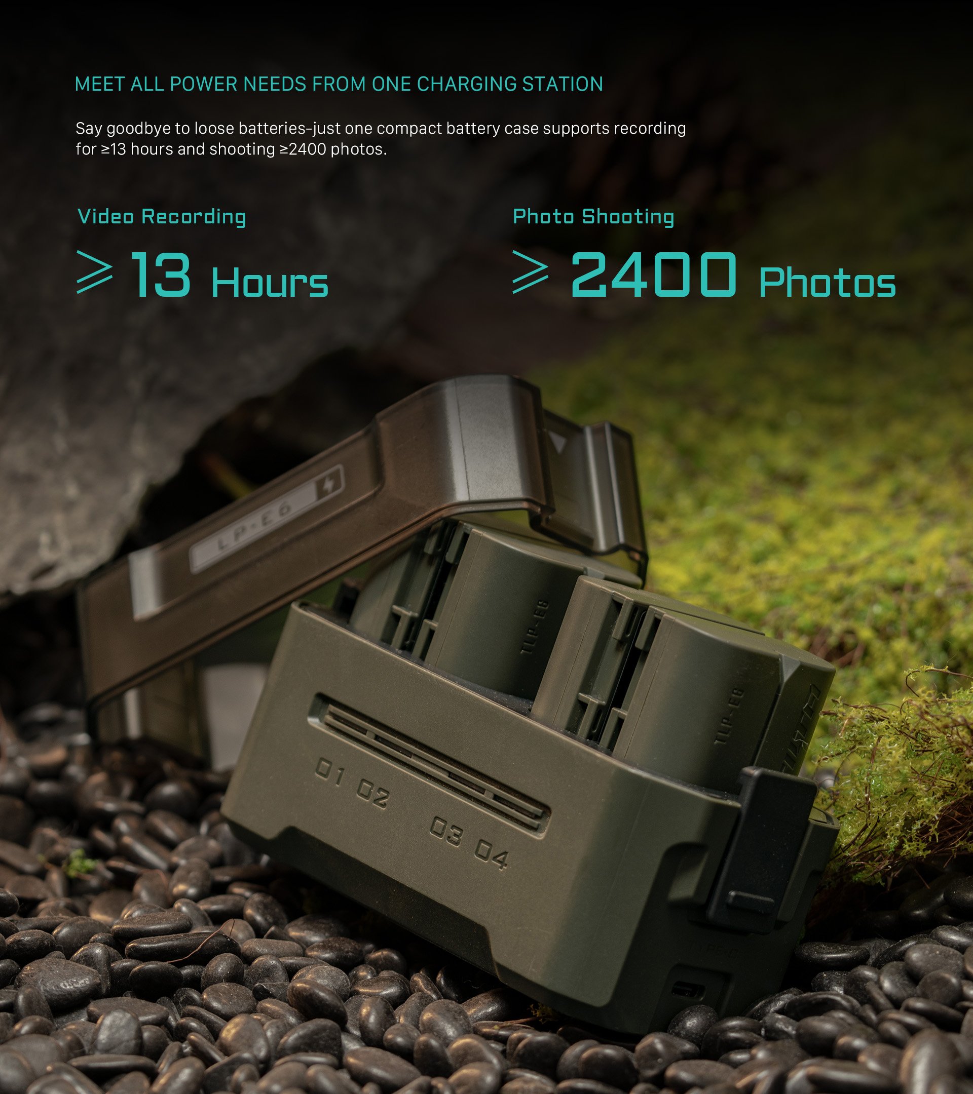Z možnostjo popolnega polnjenja štirih baterij LP-E6 bodo uporabniki pripravljeni na do 13 ur snemanja videoposnetkov ali dovolj energije za 2 400 fotografij, kar je idealno za dolgotrajno fotografiranje.