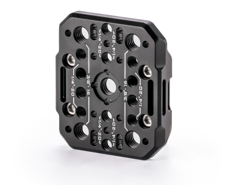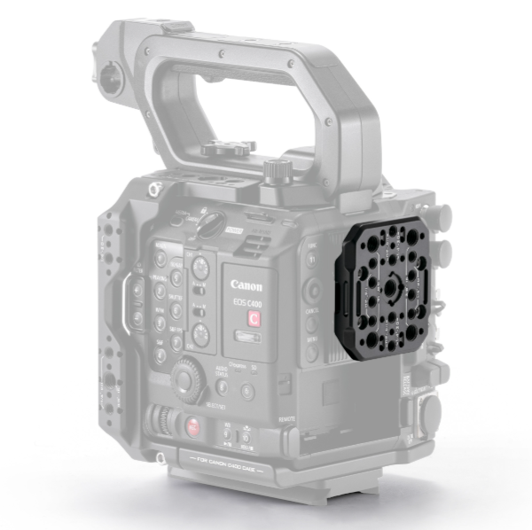 Ta vsestranska zadnja plošča na najpreprostejši možni način razširja možnosti pritrditve kamere Canon C400. Izdelana je iz aluminijeve zlitine z nerjavečim jeklom in mat črno površino, varno se pritrdi na zadnje navoje kamere in ponuja mrežo navojev za pritrditev ARRI standardnih lokacijskih zatičev (1/4"-20 in 3/8"-16) za trdno pritrditev dodatkov. Vgrajene reže za trakove omogočajo varno pritrditev mini baterijskih plošč (kot so Tilta), nosilcev SSD ali oddajnikov z elastiko ali velcro trakom, ne da bi povečali obseg. S težo le 0,5 lb dodaja minimalno težo, hkrati pa bistveno poveča funkcionalnost – idealna je za dokumentarne filme in gimbal nastavitve, kjer bi bila polna kletka preveč, dodatna moč ali dodatki pa so nujni.